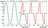 Hoe elegant en simpel beide oplossingen ook zijn, ze werken alleen voor resistieve belasting (of te wel: gloeilampen). Echter, het wordt, in ieder geval in Nederland, steeds lastiger om gloeilampen te kopen en in de nabije toekomst kun je alleen nog maar LED-lampen kopen. Het probleem met LED-lampen is dat je ze niet met de hiervoor beschreven methoden kunt dimmen. Dimbare LED-lampen kun je alleen dimmen met een techniek die Pulse Wide Modulation (PWM) heet. Met PWM schakel je met een (relatief) hoge frequentie de spanning steeds heel even aan- en weer uit.