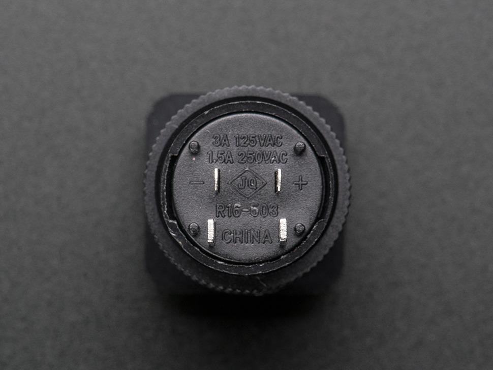 De behuizing van de knop is gemaakt van zwart plastic en huisvest de green led. Er zijn twee contacten voor de knop en twee voor de led, waarvan er één gemarkeerd is met + en één met -. De doorlaatspanning van de led is ongeveer 2,2 V, dus het is aan te raden om een weerstand van 220 tot 1000 ohm in serie aan te sluiten op uw voeding van 3 V of hoger.