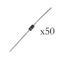 Dit is een set van 50x 1N4148 small signal diodes met een maximale doorlaatspanning van 75V en een maximale stroom van 300mA.