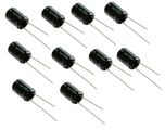 Een set van 10 elektrolytische condensatoren. Deze elektrolytische condensatoren hebben een capaciteit van 1μF met een tolerantie van 20%. De condensatoren kunnen worden aangesloten op een spanning van maximaal 450V.