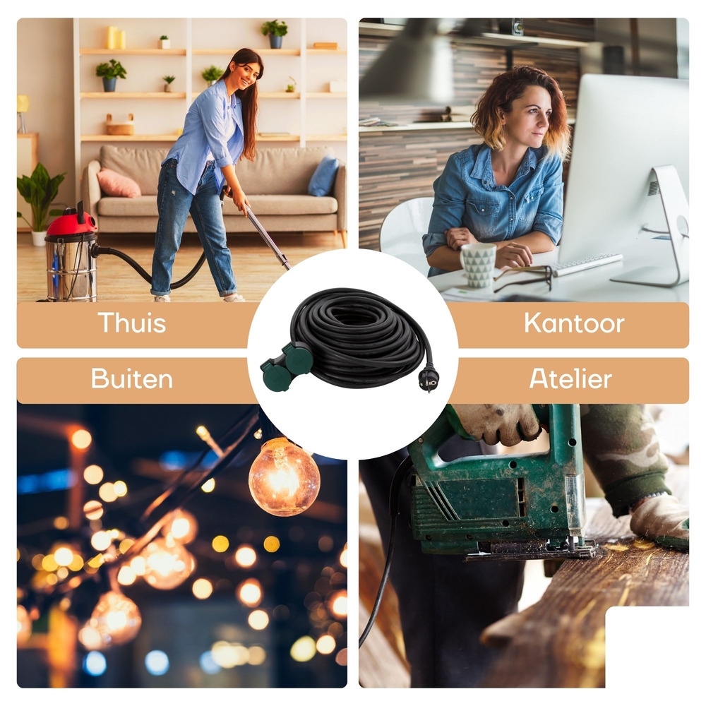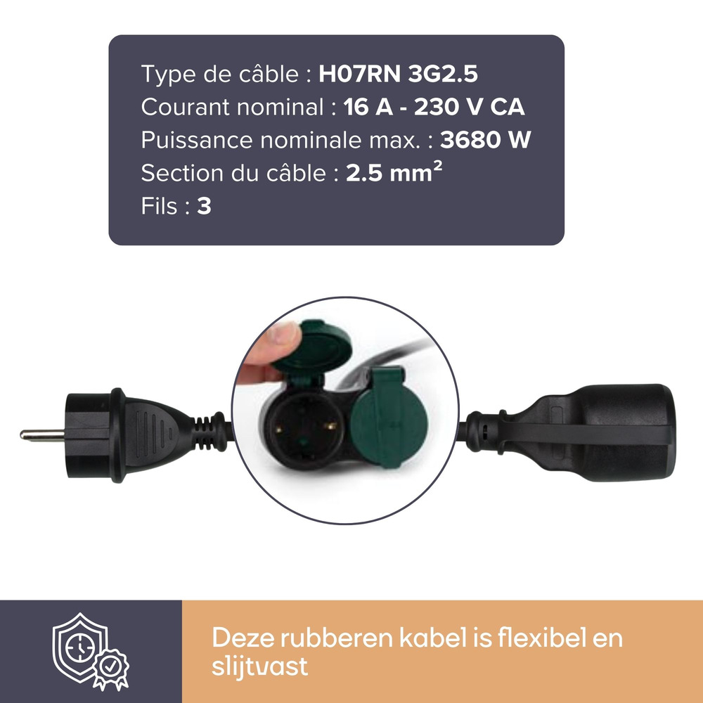Met een stevige 3G2.5 kabelspecificatie ondersteunt het moeiteloos apparaten met een hoog vermogen, waardoor efficiënte energiedoorvoer wordt gegarandeerd. De geaarde contacten bieden extra veiligheid en verkleinen het risico op een elektrische schok. Of je nu een grasmaaier of feestelijke verlichting van stroom moet voorzien, dit verlengsnoer biedt consistente prestaties over lange afstanden.