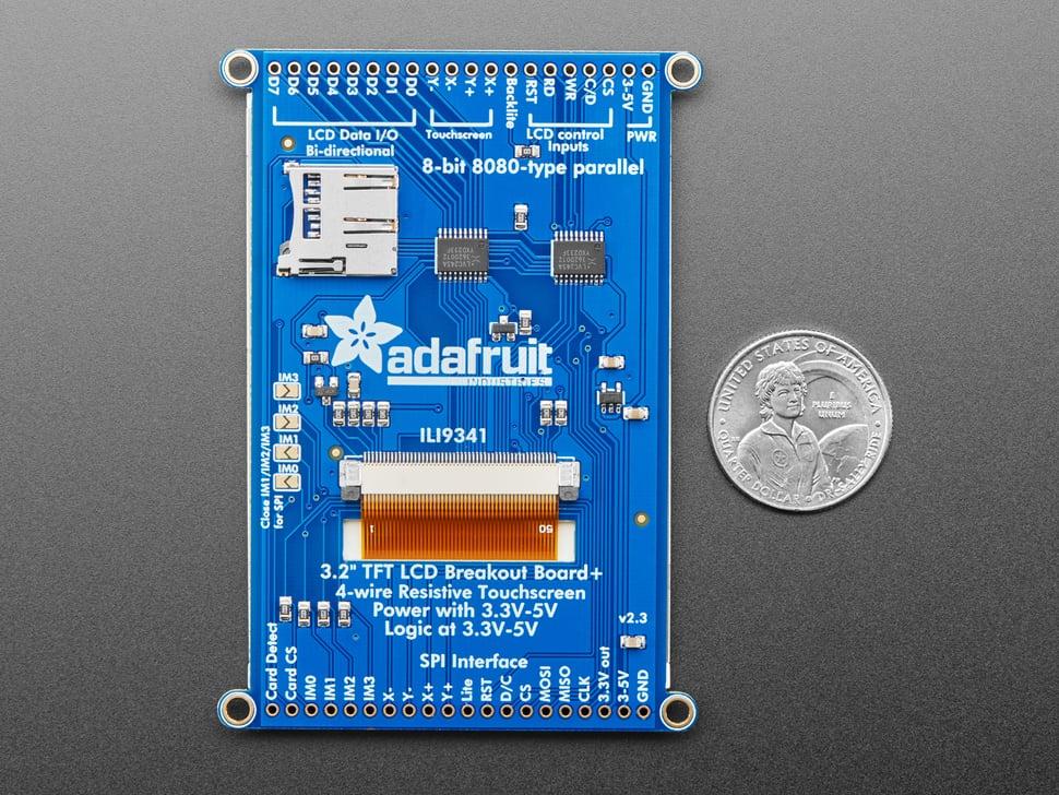 Kies uit twee modi: 8-bits met 8 digitale datalijnen en 4 of 5 besturingslijnen, of de gestroomlijnde SPI-modus met slechts 5 pinnen, wat het eenvoudiger maar iets langzamer maakt. Touchscreen-interactie vereist 4 pinnen of de optionele resistieve touchscreen-controller om I²C of SPI te gebruiken. Het gebruiksvriendelijke breakout board ondersteunt 3-5V met snelle level shifters die compatibel zijn met elke microcontroller.