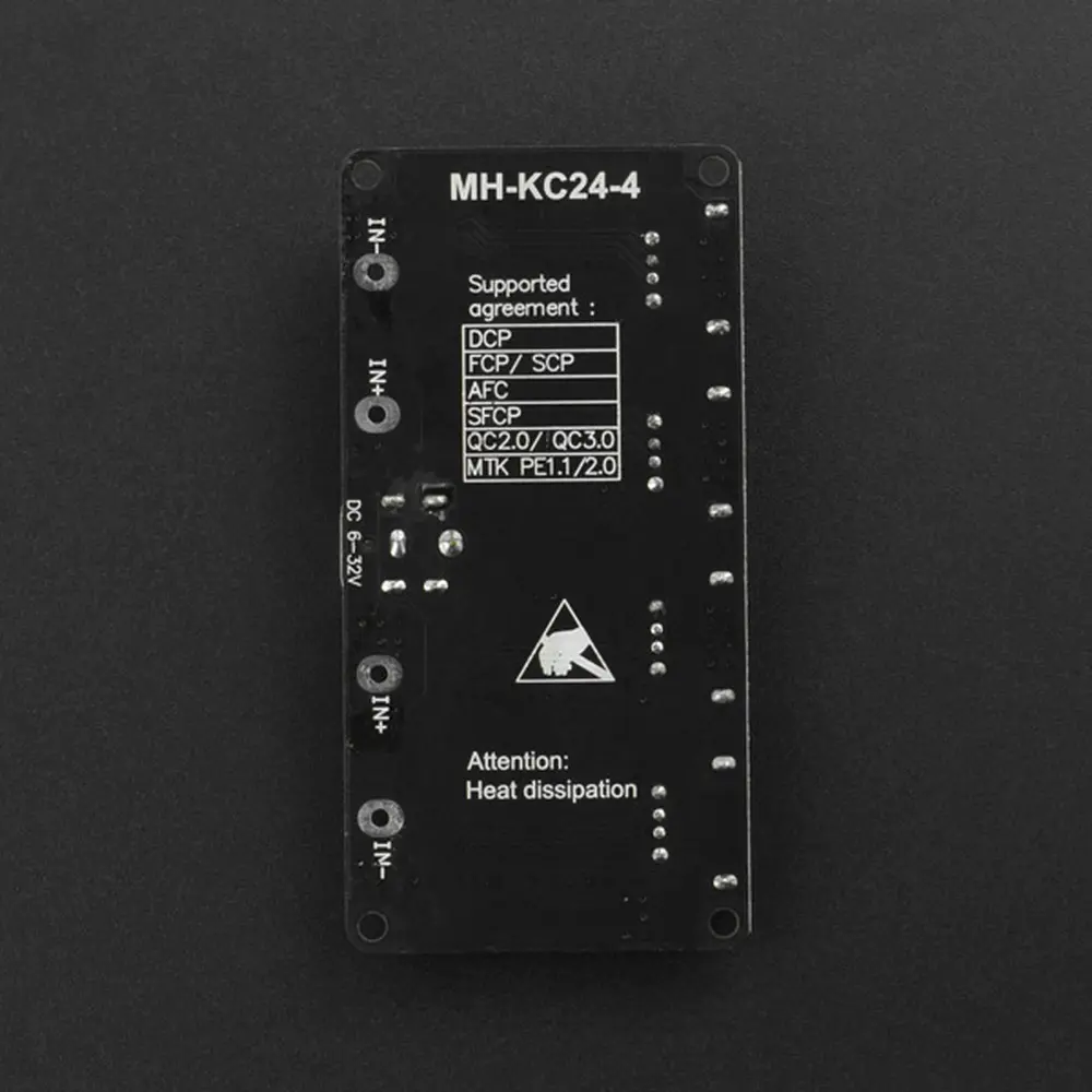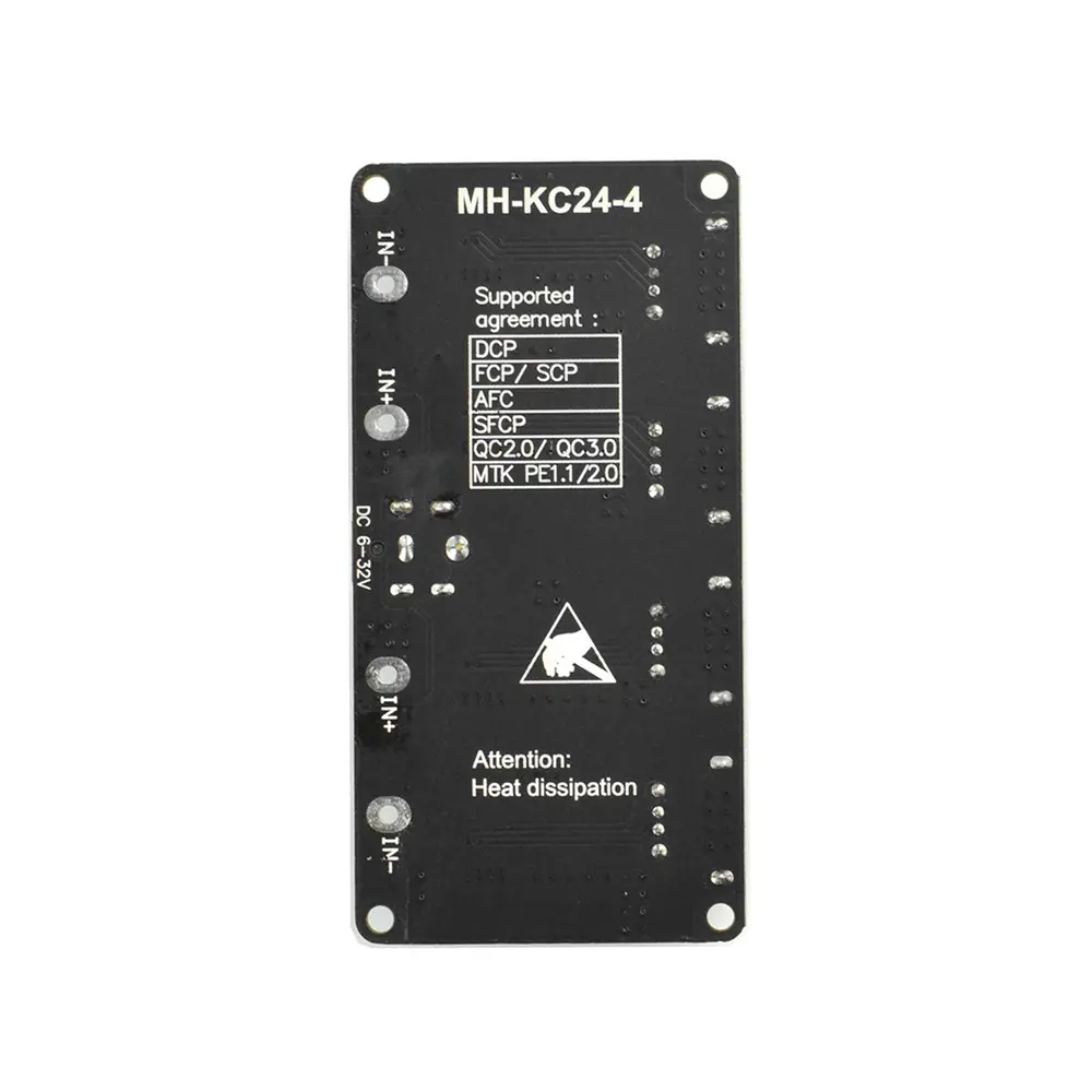 Met een aanpasbaar ingangsbereik van 6 tot 32 V en een instelbare output van 3 tot 12 V, standaard ingesteld op 5 V, maakt deze module gebruik van snellaaddecoytechnologie om spanningsniveaus naadloos aan te passen. De module ondersteunt meerdere snellaadprotocollen, waardoor elk van de vier kanalen onafhankelijk kan werken, wat flexibiliteit en betrouwbaarheid biedt.