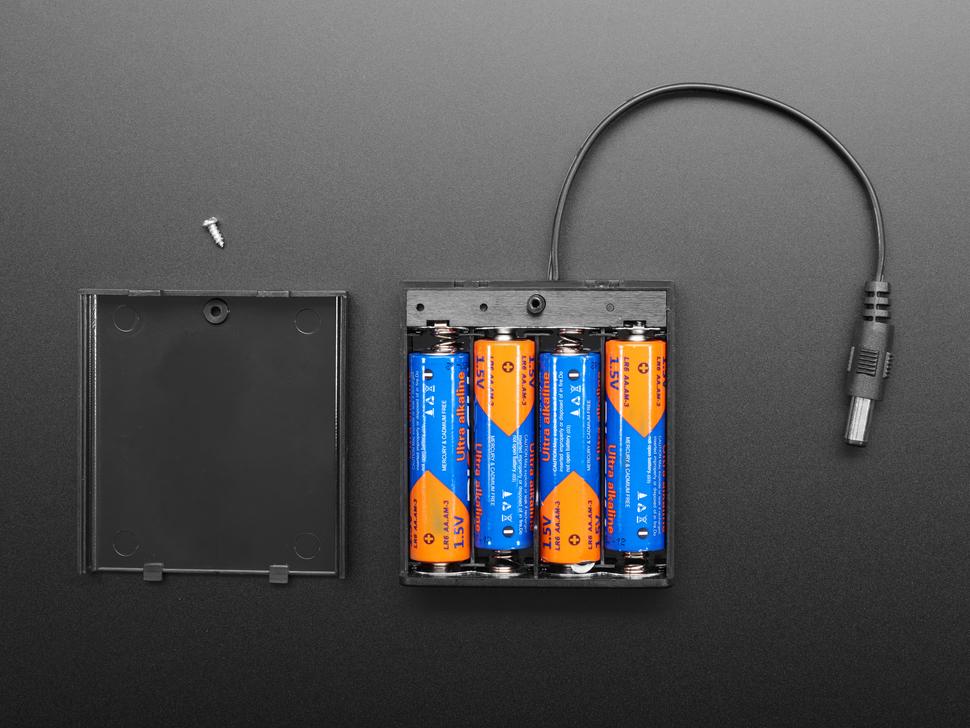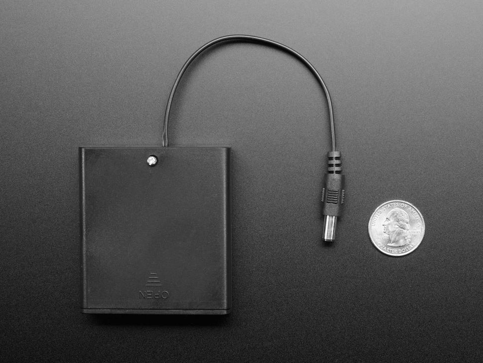 Deze AA-batterijhouder biedt plaats aan vier batterijen en is voorzien van een 13 cm lange stroomkabel met een 5,5/2,1 mm DC-aansluiting. Hij is voorzien van een aan/uit-schakelaar en heeft een strak Adafruit zwart design.