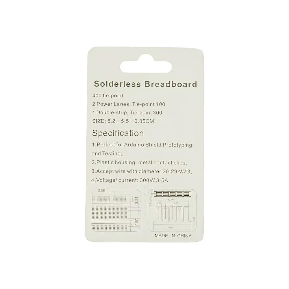 Het 400 Tie Point Interlocking Solderless breadboard is ontworpen voor veelzijdigheid en ruimtebesparing. Met afmetingen van 8,2 cm bij 6,2 cm beschikt het over een standaard dubbele strip in het midden en twee gemakkelijk verwijderbare stroomrails aan de zijkanten. Dit ontwerp zorgt voor naadloze integratie in diverse elektronicaprojecten, met name bij gebruik van compacte opstellingen.