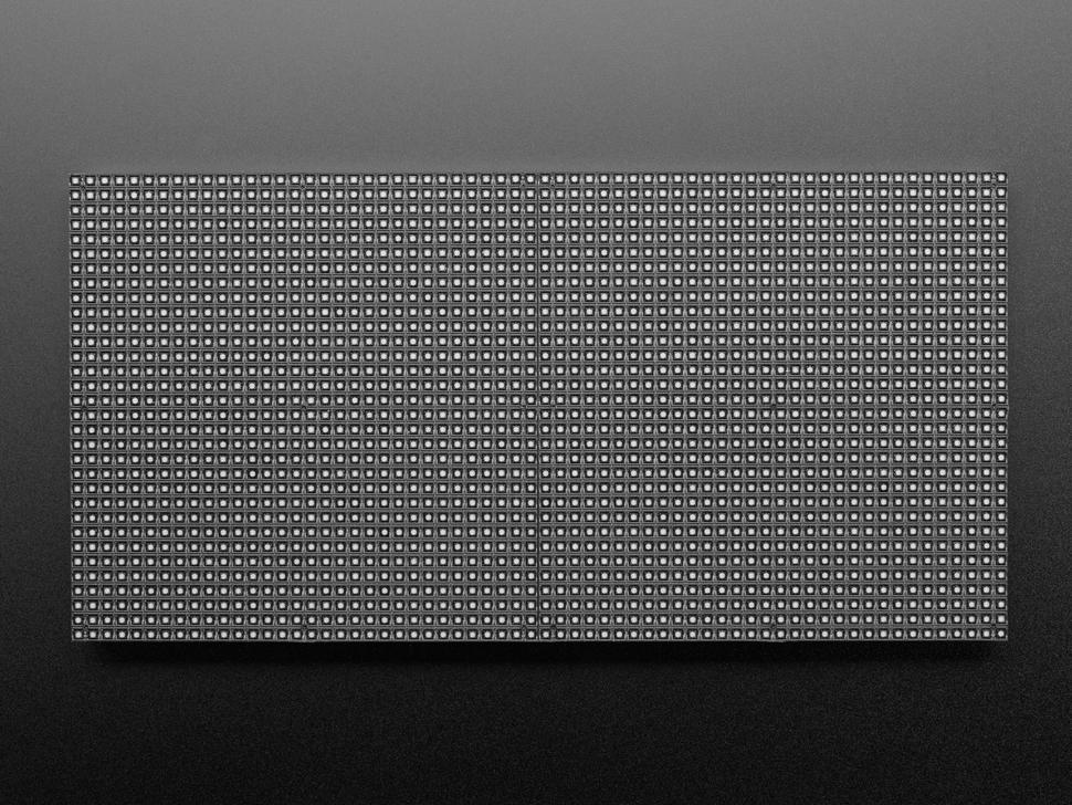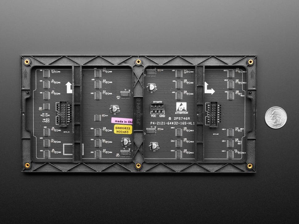 Deze matrix heeft 2048 heldere RGB-leds die aan de voorkant in een raster van 64x32 zijn gerangschikt. Aan de achterkant bevindt zich een printplaat met twee IDC-connectoren (één ingang, één output : in theorie kun je deze aan elkaar koppelen) en 12 16-bits latches waarmee je het display kunt aansturen met een scansnelheid van 1:16.