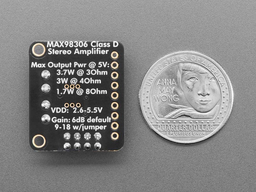 Deze ongelooflijk kleine stereoversterker is verrassend krachtig - in staat om 2 x 3,7 W kanalen te leveren aan luidsprekers met een impedantie van 3 ohm. In de miniatuurchip zit een klasse D-controller, die kan werken van 2,7 V-5,5 VDC. Omdat de versterker een klasse D is, is hij ongelooflijk efficiënt (meer dan 90% efficiënt bij het aansturen van een 8Ω-luidspreker van meer dan een watt) - waardoor hij perfect is voor draagbare en batterijgevoede projecten. Het heeft een ingebouwde thermische en overstroombeveiliging, maar we konden nauwelijks zien dat het heet werd. Dit board is een welkome upgrade naar basis "LM386" versterkers!