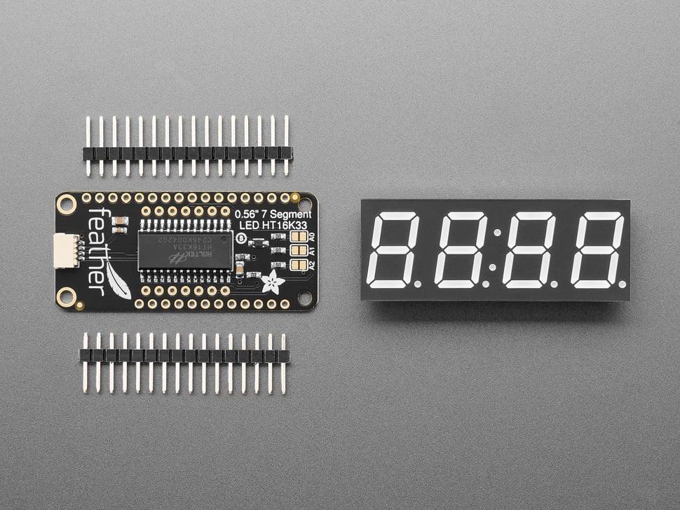 De inhoud van het pakket bestaat uit een volledig gemonteerd Adafruit 4-cijferig 7-segment LED- display FeatherWing , een helder viercijferig display en twee zestien-pins headers . Met slechts een beetje soldeerwerk is het display op de FeatherWing te monteren.