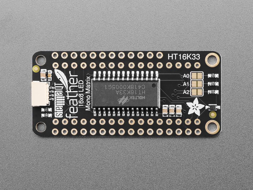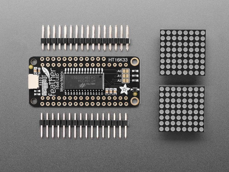 De kit bevat een voorgeteste 16x8 0,8" LED FeatherWing , twee ultrafelle vierkante gele matrixen en een paar 16-pins headers . De montage vereist minimale soldeerwerkzaamheden en is in ongeveer 15 minuten te realiseren.