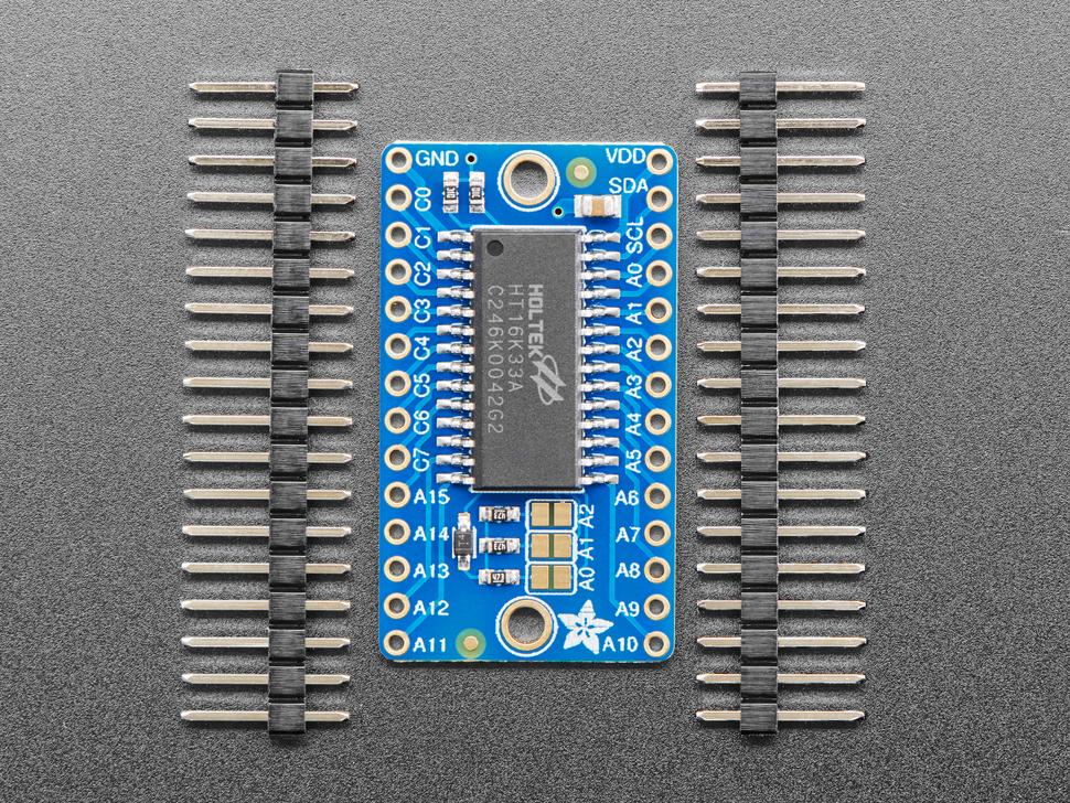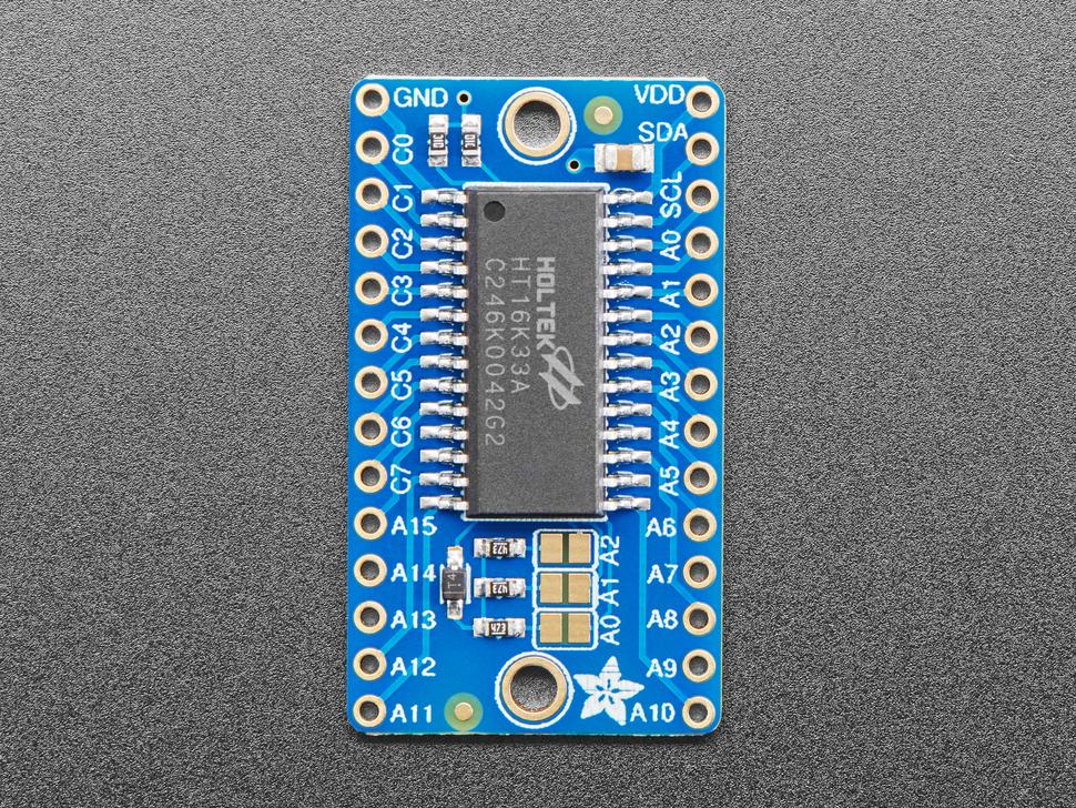 Dit is de magische saus in onze 7-segment- en matrixrugzakken, nu verkrijgbaar in een breadboard -vriendelijk breakout board . De HT16K33 is een handige kleine chip die een gemultiplexte 16x8 matrix kan aansturen, wat overeenkomt met 128 individuele leds.