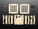 Inhoud: één zwarte acryl uitsparing van 1,5 mm dik, tien transparante acryl uitsparingen van 3 mm dik, een complete set schroeven, afstandhouders en moeren, en kleine rubberen stootkussentjes. Zorg ervoor dat u de beschermende papieren achterkant van de acryl uitsparingen verwijdert voordat u ze in elkaar zet.