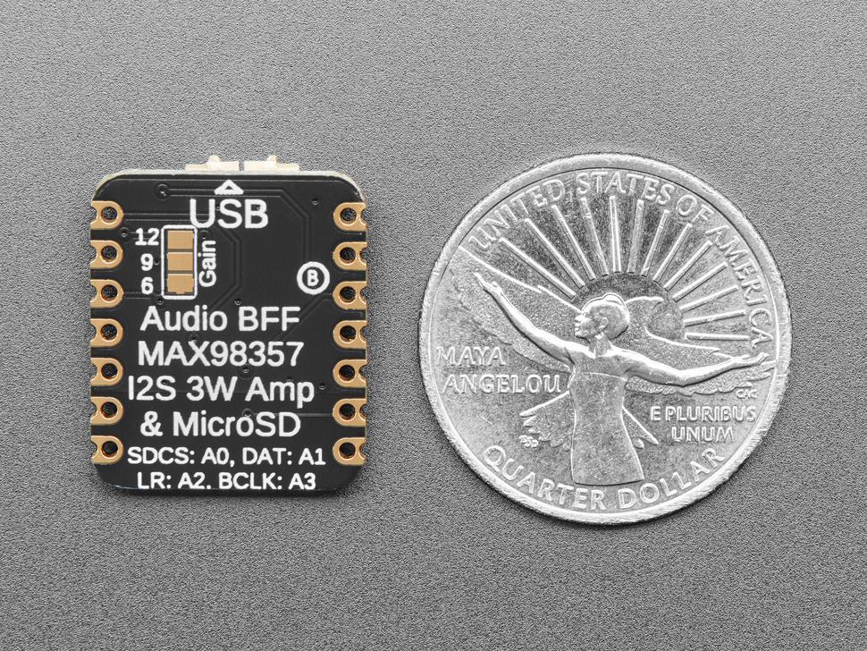 Verander je QT Py in een stevige audio-afspeelapparaat met de Adafruit Audio BFF, die een MicroSD-kaartslot tot 64 GB ondersteunt en een I2S 3 Watt versterker heeft. Dit compacte board bevestig je eenvoudig aan je QT Py of Xiao, door te solderen of met verwijderbare pin- en sokkels headers.