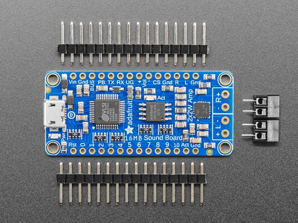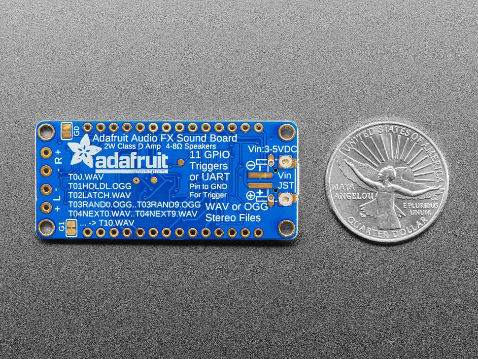 Het Adafruit board maakt het toevoegen van audio-effecten aan elk project eenvoudig. Met een afmeting van slechts 4,8 x 2,1 cm (0,85 inch) zijn er geen microcontrollers nodig en werkt het apparaat uitsluitend op een voeding van 3 tot 5,5 V DC. Met een ingebouwde opslagruimte van 16 MB kunt u audiobestanden eenvoudig via USB slepen en neerzetten.