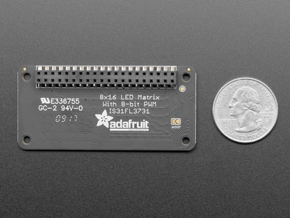 De IS31FL3731 is een leuke kleine chip – en hij werkt prima op 3,3V. Er is voldoende RAM-geheugen aanwezig voor 8 afzonderlijke frames display , zodat je meerdere frames van een animatie kunt instellen en ze met één commando kunt omdraaien om ze weer te geven. Omdat hij I²C gebruikt, neemt hij alleen de SDA/SCL-pinnen van je Pi in beslag en kan hij die pinnen delen met andere I²C-apparaten en sensoren. Hij wordt volledig gemonteerd geleverd, zonder te solderen, dus je kunt hem direct aansluiten.