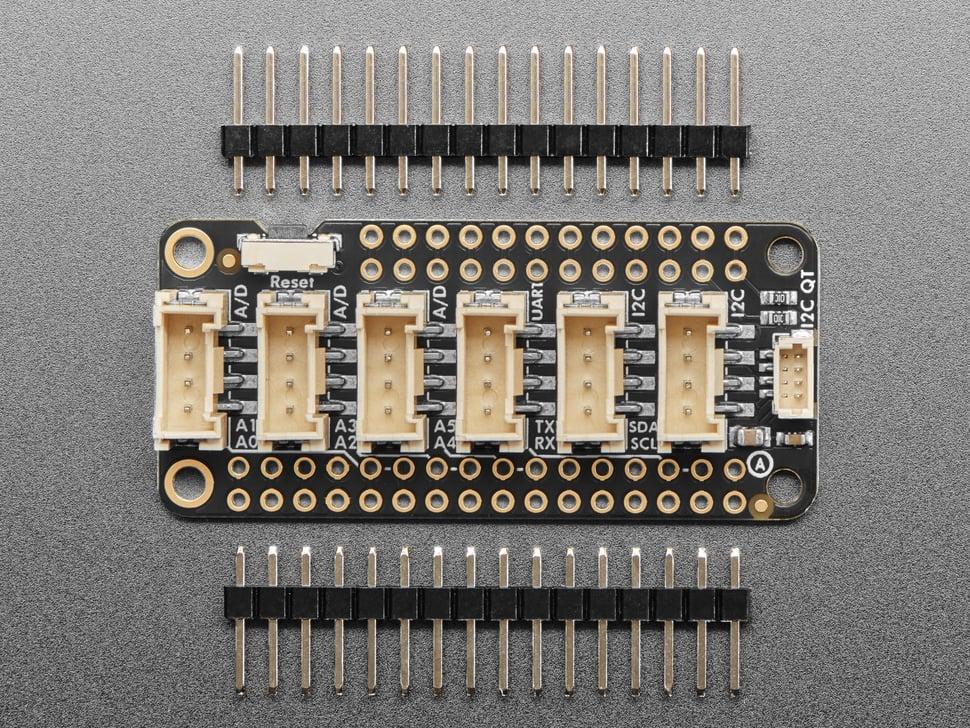Het pakket bevat een gemonteerde FeatherWing en twee 16-pin headers, waarvoor je een beetje moet solderen om ze aan je Feather te bevestigen. Deze setup is ideaal om de connectiviteit en functionaliteit van je project te verbeteren.