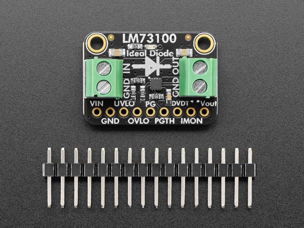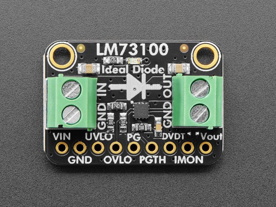 Als je project efficiënte stroombeheer nodig heeft, is de Adafruit LM73100 Ideal Diode breakout een onmisbare tool. Het reguleert stroom effectief van 3 tot 23V DC en tot 5A.