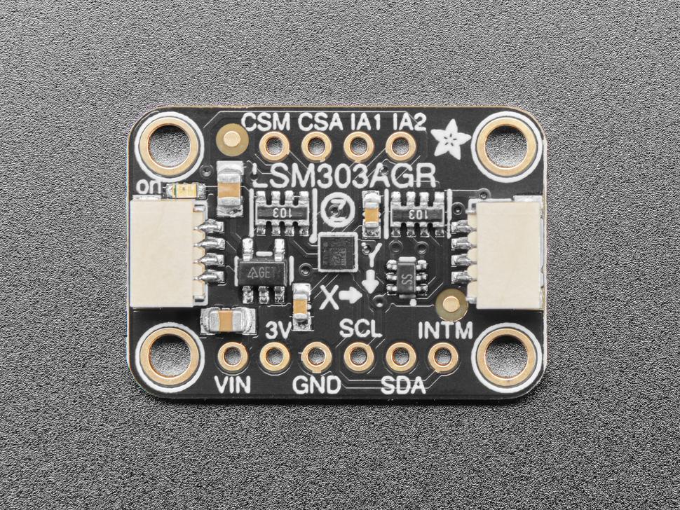 We hebben deze breakout gebaseerd op de nieuwste versie van de populaire LSM303 sensor, de LSM303AGR. Deze compacte sensor maakt gebruik van I2C voor communicatie en is supermakkelijk in gebruik. Download gewoon onze bibliotheek en verbind de SCL-pin met je I2C klok-pin en de SDA-pin met je I2C data-pin, en upload ons testprogramma om de data van de versnellingsmeter en het magnetisch veld uit te lezen.