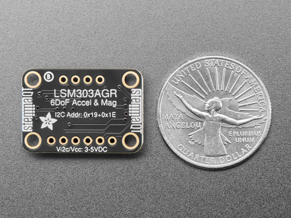 Om het leven wat makkelijker te maken zodat je je kunt concentreren op je belangrijke werk, hebben we de LSM303AGR op een breakout PCB gezet, samen met ondersteunende schakelingen om deze kleine wonder te laten werken met 3.3V (Feather/Raspberry Pi) of 5V (Arduino/Metro328) logische niveaus. Bovendien, omdat het via I2C spreekt, kun je het gemakkelijk aansluiten met twee draden, plus voeding en aarde.