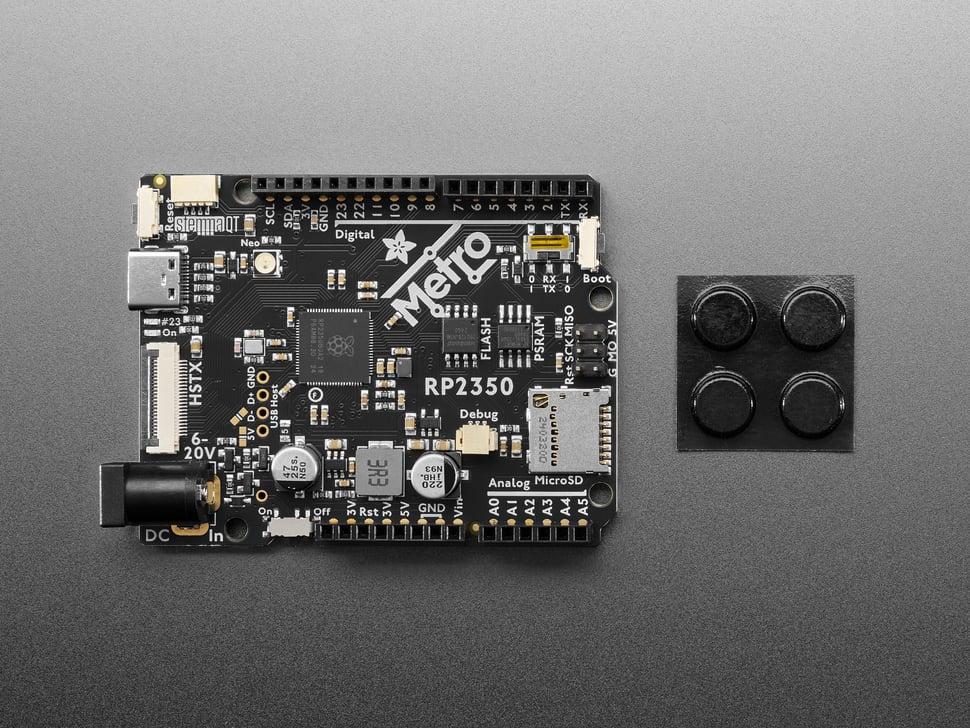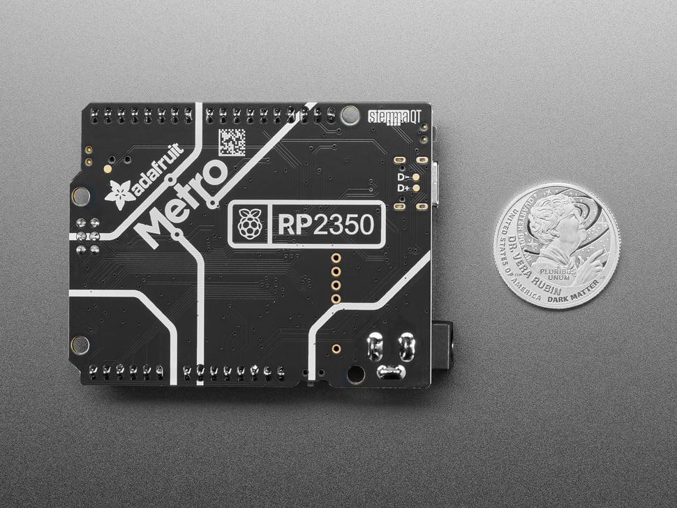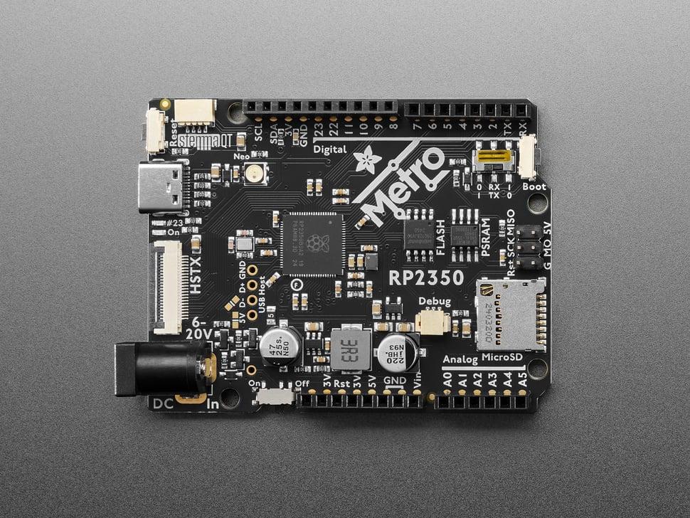 Choo! Choo! Dit is de RP2350 Metro Lijn, die stopt bij alle stations: "Dual Cortex M33 berg", "528K RAM rotonde" en "16 Megabytes Flash stad", met een extra stop bij "8 Megabytes PSRAM dorp". Deze trein zit vol met hardware-essentials voor een uitgebreide ontwikkelbord die projecten ondersteunt die compatibiliteit met Arduino-vorm of extra ruimte en debuggingbronnen nodig hebben.