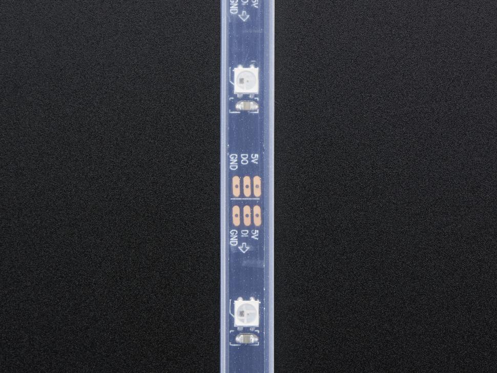 De PWM is ingebouwd in elke LED-chip, dus zodra je de kleur hebt ingesteld, kun je stoppen met communiceren met de strip en blijft deze alle LED's voor je PWM-en. De strip is gemaakt van flexibel PCB-materiaal en wordt geleverd met een weerbestendige omhulling. Je kunt dit materiaal vrij eenvoudig knippen met een draadkniptang; er zijn kniplijnen om de 32,5 mm (1 LED per stuk). Soldeer aan de 2,5 mm koperen pads en je bent klaar. Je kunt de strips natuurlijk ook aan elkaar koppelen om ze langer te maken, maar let wel op hoeveel stroom je nodig hebt! We hebben een 5V/2A-voeding die 1 meter zou moeten kunnen aansturen en een 5V/10A-voeding die tot 10 meter kan aansturen (afhankelijk van het gebruik). Je moet een 5V DC-voeding gebruiken om deze strips van stroom te voorzien; gebruik niet meer dan 6V, anders kun je de hele strip kapotmaken.