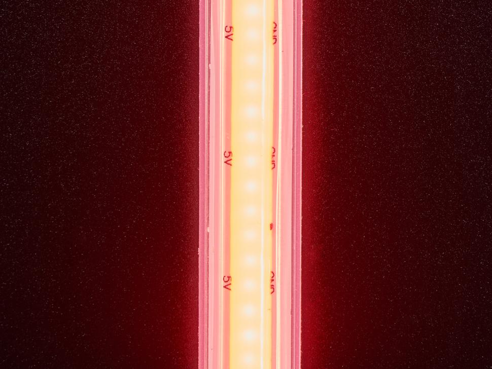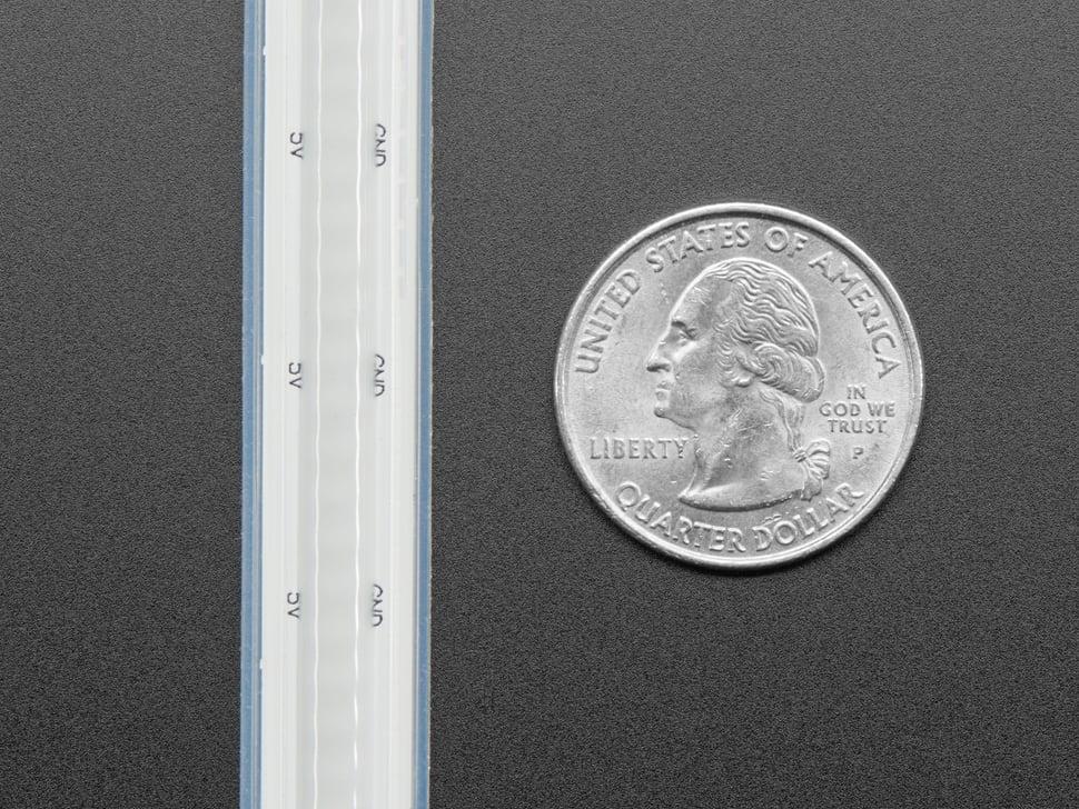 De Adafruit NeoPixel 332 LED-per-meter Siliconen Kraal LED Strip is 0,5 meter lang en 14mm breed. Hij heeft aan de uiteinden een JST SM 3-pin stekker en socket, met vooraf geïnstalleerde 10cm kleurgecodeerde draden: zwart voor de massa, groen voor het signaal, rood voor 5V DC voeding.