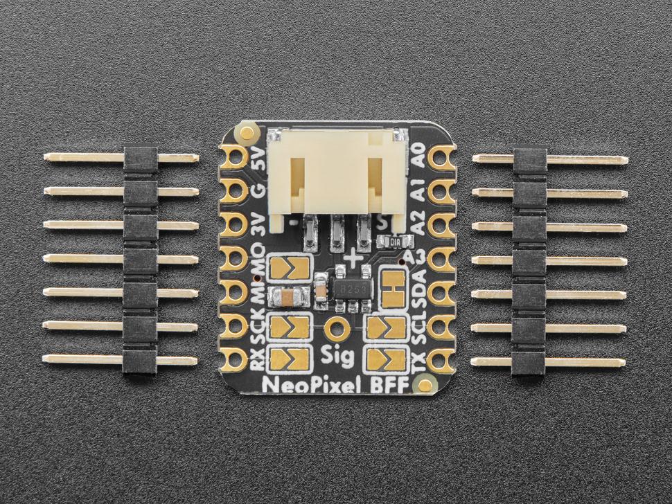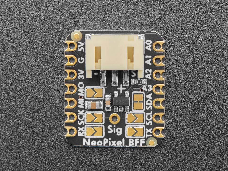 Maak makkelijk verbinding met NeoPixel-strips met JST-PH connectors, voor directe verlichtingsoplossingen. De NeoPixel Driver BFF is niet aan te raden voor het rechtstreeks voeden van meer dan 30-60 NeoPixels vanwege de 2 Ampère stroomlimiet van de PH connectors.