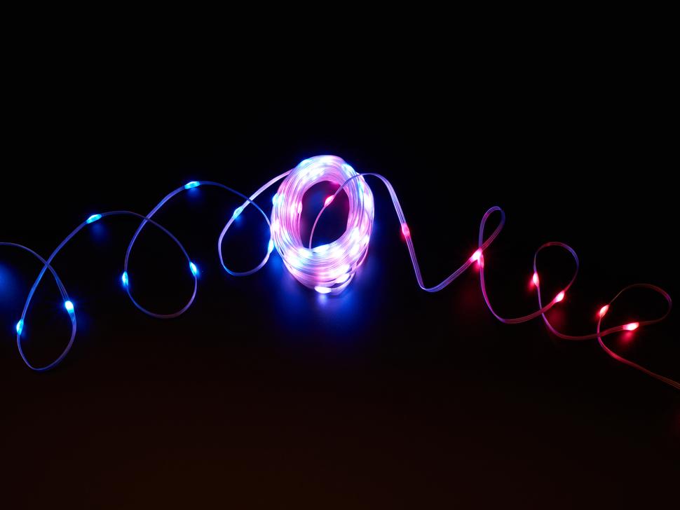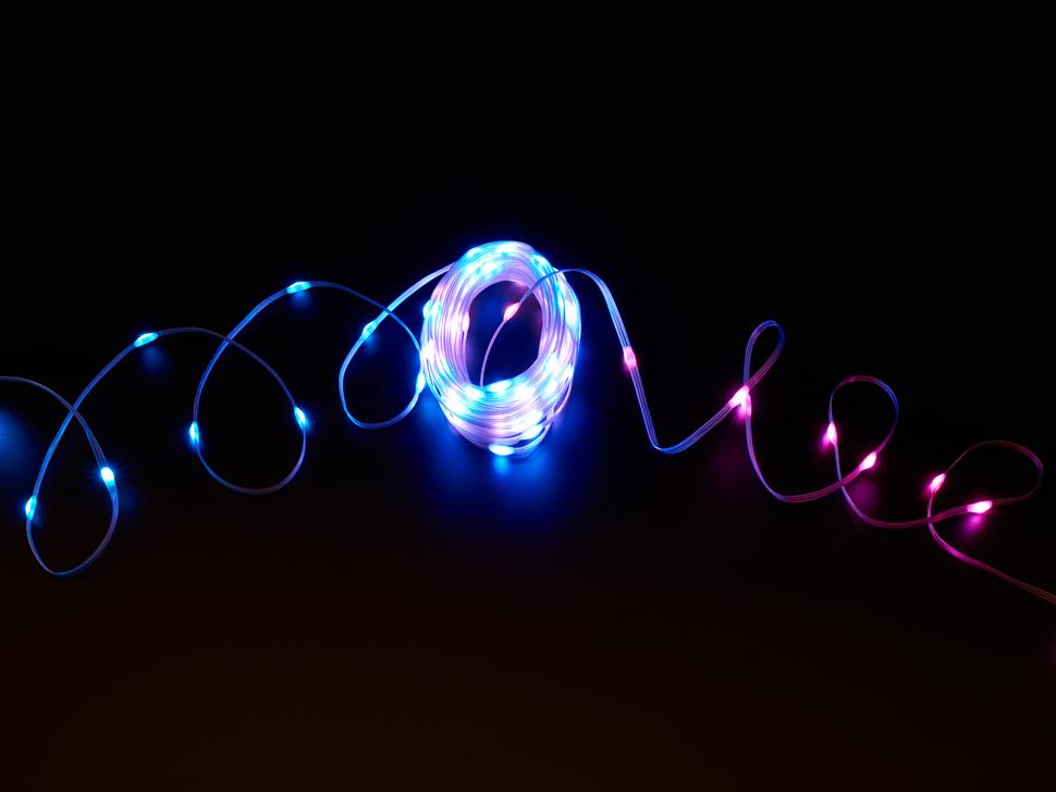 De LED's zijn makkelijk aan te sluiten, met vooraf bevestigde connectors en markeringen die de stroom-, grond- en dataverbindingen aangeven. Gebruik de meegeleverde tutorial voor instructies over bedrading en codering.