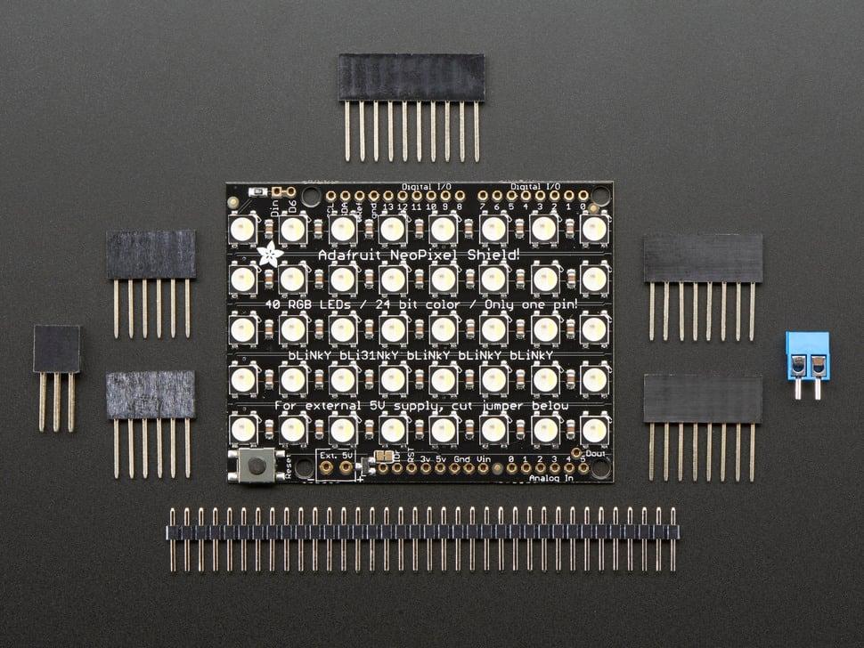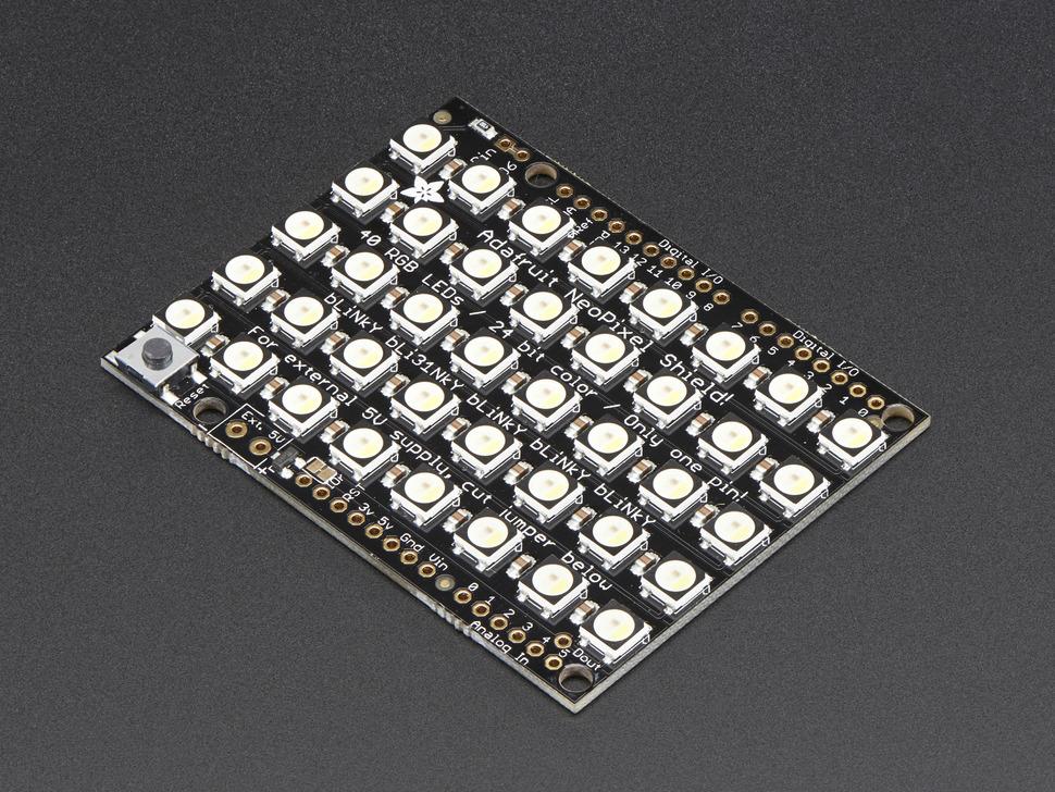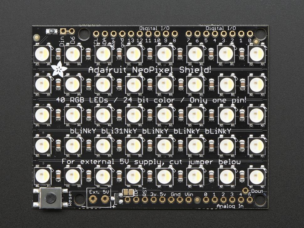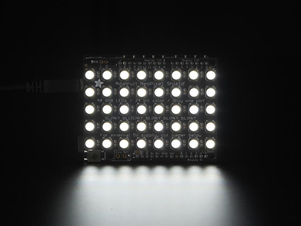 Zet je zonnebril op voordat je dit shield aan je Arduino toevoegt. Het schild is voorzien van 40 opvallende RGBW-leds in een 5x8-matrix voor een explosie van levendige kleuren. Elke pixel is individueel adresseerbaar, waardoor er slechts één pin (digitaal nr. 6) nodig is voor de aansturing, maar personalisatie is mogelijk met andere pinnen.