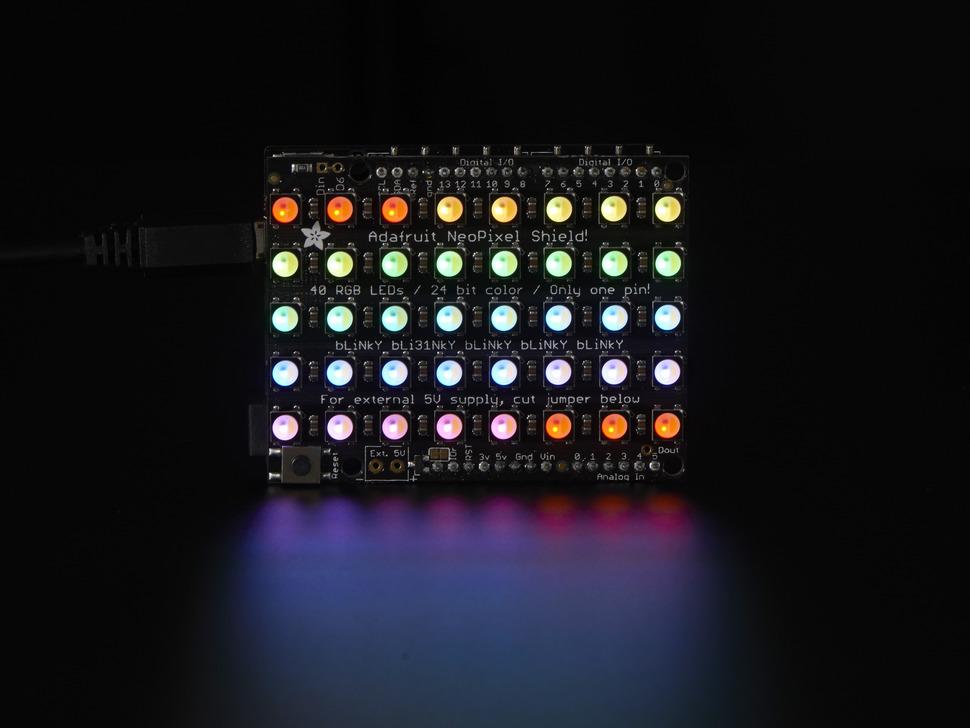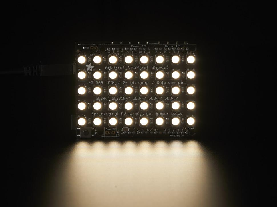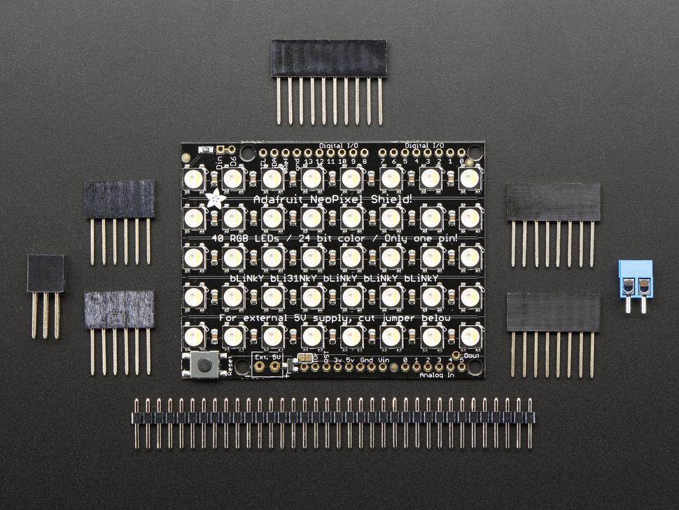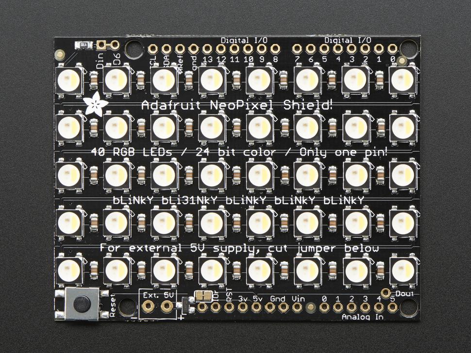 Zet je zonnebril op voordat je dit shield op je 'duino plaatst. Met 40 oogverblindende RGBW-leds die het NeoPixel- shield sieren, staat je een explosie aan configureerbare kleuren te wachten. Elke pixel is in een 5x8 matrix geplaatst, is individueel adresseerbaar en je hebt slechts één pin (Digitale #6) nodig om alle leds te beheren. Als maatwerk noodzakelijk is, knip dan een trace en gebruik vrijwel elke gewenste pin.