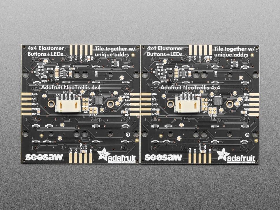 Of u nu een innovatieve gebruikersinterface, een dynamisch MIDI-instrument of een geavanceerd bedieningspaneel bouwt, deze boards verrijken projecten met aantrekkelijke, diffuse verlichting. We leveren een JST-PH 4-pins connector voor snelle verbindingen en deze is gedeeltelijk compatibel met Grove. Voor grotere assemblages soldeert u de boards rand-aan-rand, sluit u de I²C- jumpers en gebruikt u één I²C-verbinding voor alle gekoppelde NeoTrellis-boards.