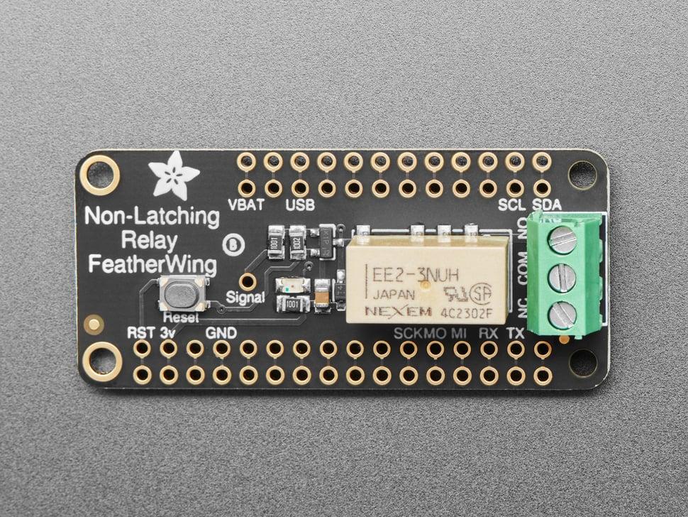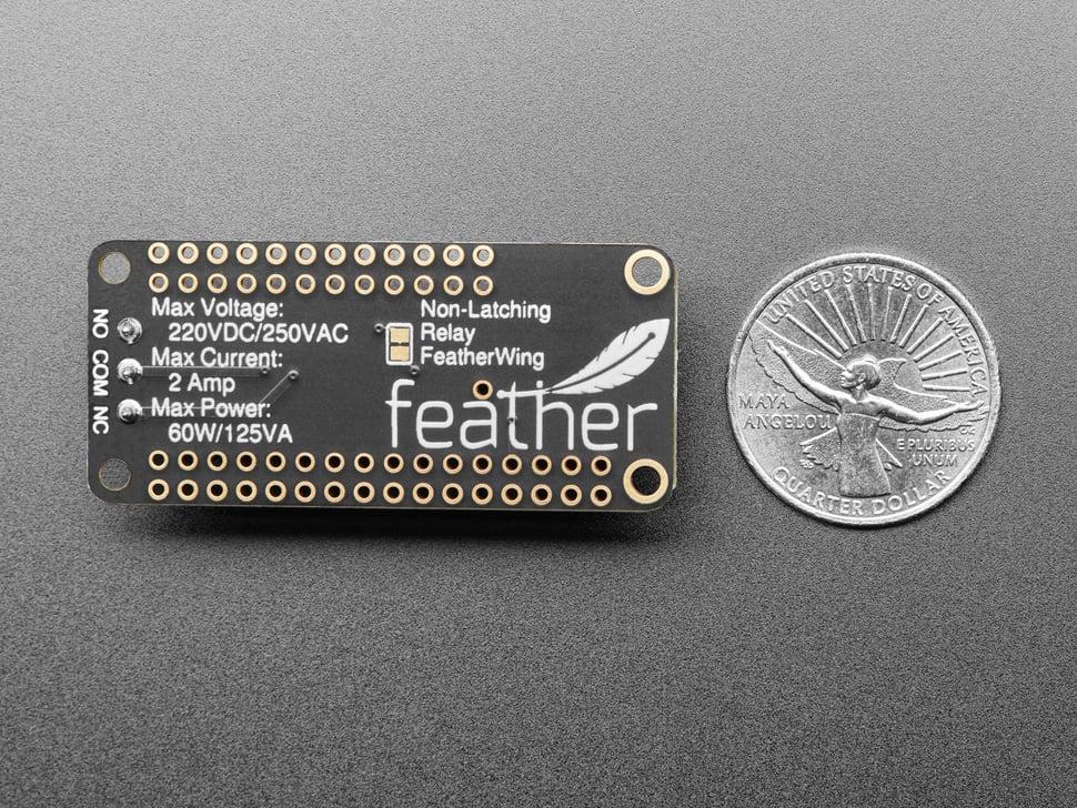 Een feather zonder ambitie is een feather zonder board ! Dit is de Non-Latching Mini Relay FeatherWing . Deze geeft je controle over de stroomvoorziening. Simpel gezegd: je kunt nu lampen, ventilatoren, solenoïdes en andere kleine apparaten die board 250 VAC of DC werken board feather