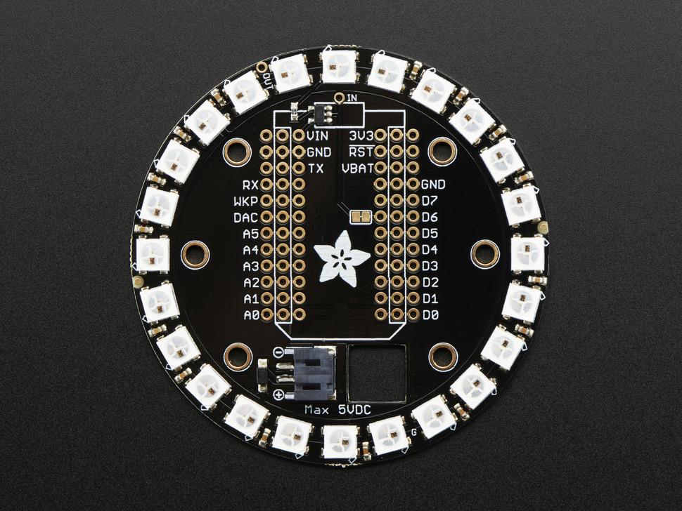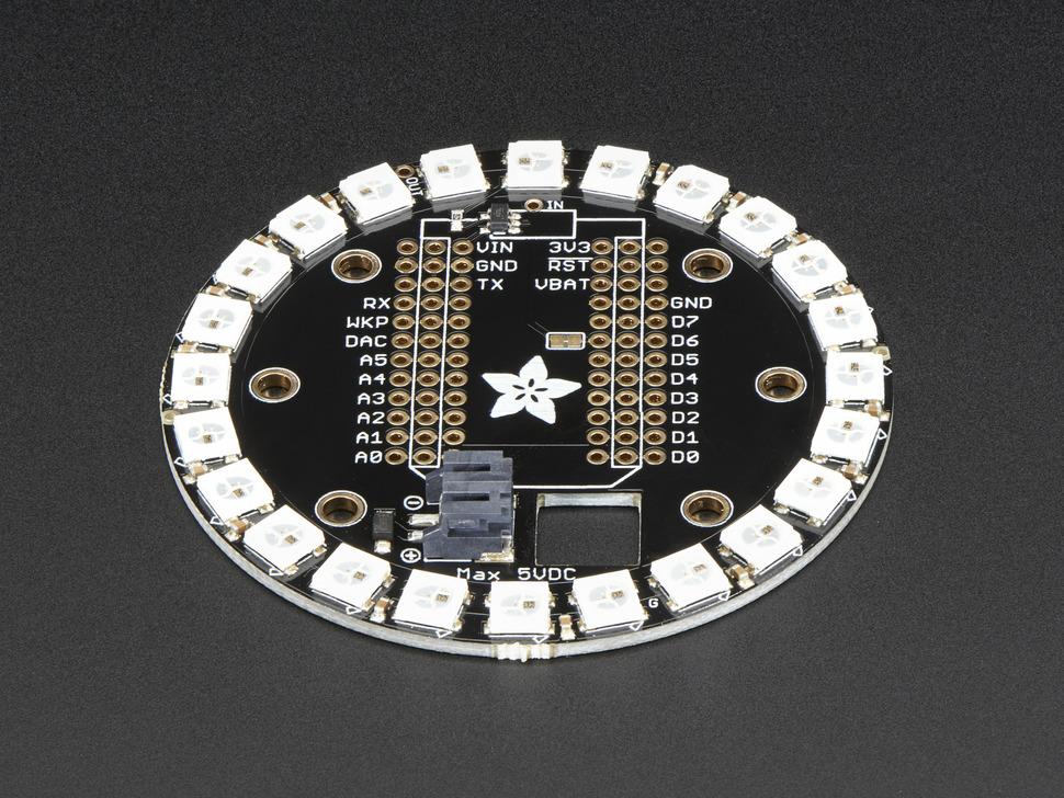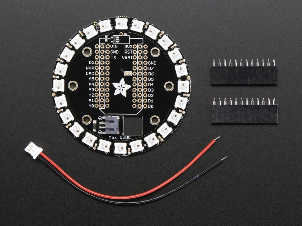 Om te coderen, klikt u eenvoudig uw Spark aan, uploadt u de NeoPixel library en gebruikt u pin D6. Extra pinnen zijn beschikbaar voor de integratie van andere sensoren of apparaten met breakout -opties aan beide zijden. De kit bevat een enkele ronde printplaat, twee 12- headers socket een extra JST-kabel.