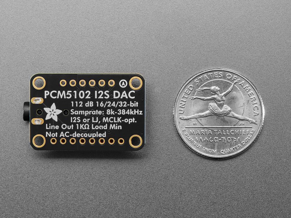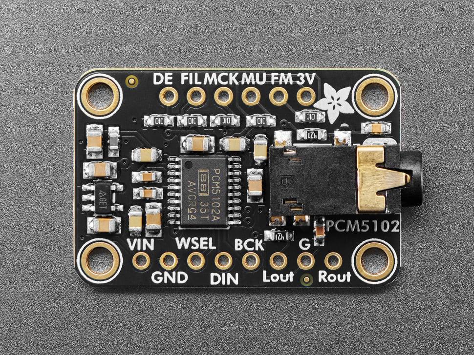 Deze opstelling heeft nu de Adafruit PCM5102 I2S DAC met line level output. Bekend om het leveren van zuivere, hoogwaardige stereo audio, en het heeft geen MCLK of I2C configuratie nodig. Je hoeft alleen I2S audio toe te voeren, en de rest regelt hij moeiteloos.