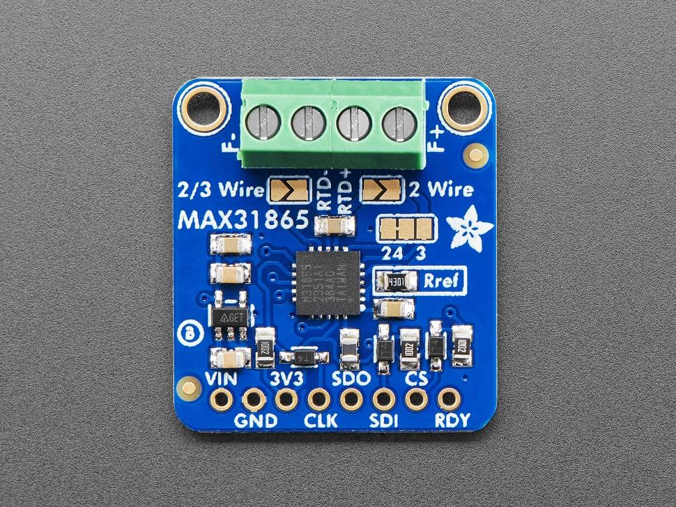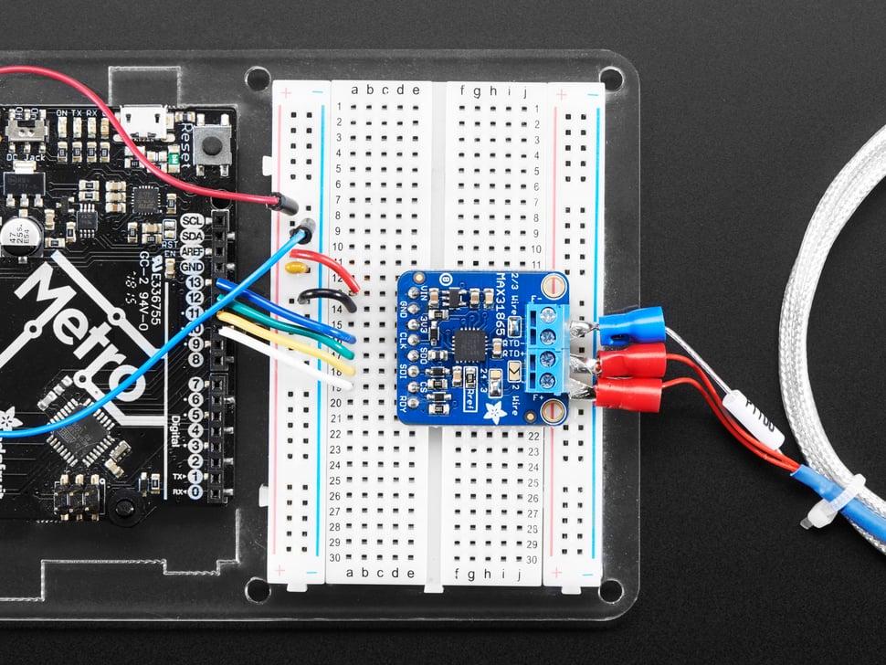 Voor optimale prestaties combineert u uw PT1000 met een versterker zoals de Adafruit RTD Sensor Amplifier met het MAX31865 breakout board , compatibel met 2-, 3- of 4-draads configuraties. Deze configuratie garandeert nauwkeurige metingen door de draadweerstand te compenseren en moeiteloos verbinding te maken met elke microcontroller via SPI.