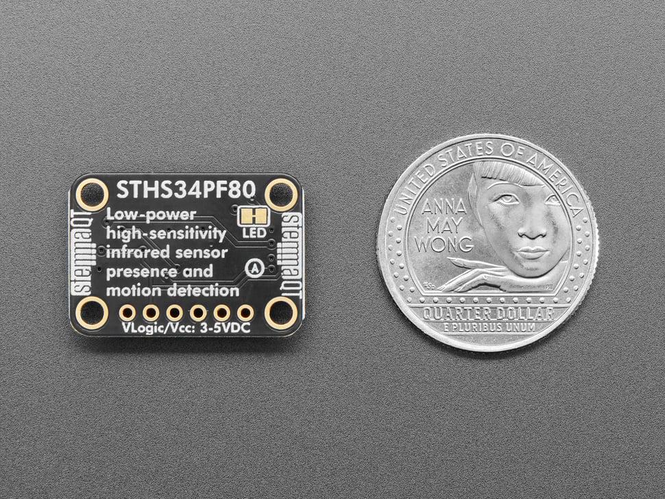 Ervaar ongeëvenaarde bewegingsdetectie met de Adafruit STHS34PF80 IR aanwezigheids-/bewegingssensor, ontworpen om traditionele PIR-sensoren te overtreffen met zijn compacte, lensloze ontwerp. Deze sensor detecteert efficiënt beweging en aanwezigheid tot op 4 meter afstand en biedt superieure integratiemogelijkheden voor krappe behuizingen.