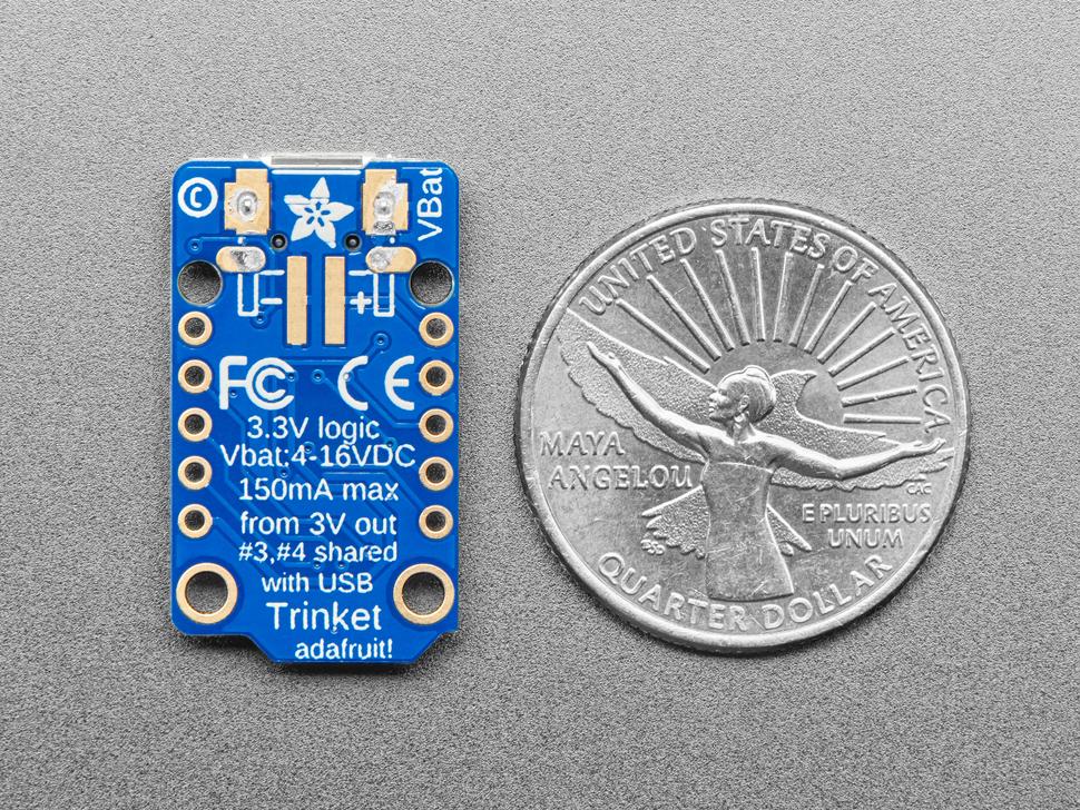 Dit is de 3V trinketEr zijn twee versies van de trinket . De ene is 3V en de andere is 5V. Beide werken hetzelfde, maar hebben verschillende logische spanningen. Gebruik de 3V-versie om te communiceren met sensoren en apparaten die 3V-logica nodig hebben, of wanneer u deze wilt uitschakelen via een LiPo-batterij. De 3V-versie zou alleen op 8 MHz moeten werken. Gebruik de 5V-versie voor sensoren en componenten die 5V-logica kunnen gebruiken of vereisen. De 5V-versie kan werken op 8 MHz of op 16 MHz door de softwarematige klokfrequentie in te stellen.