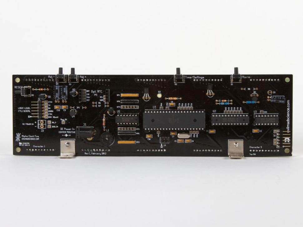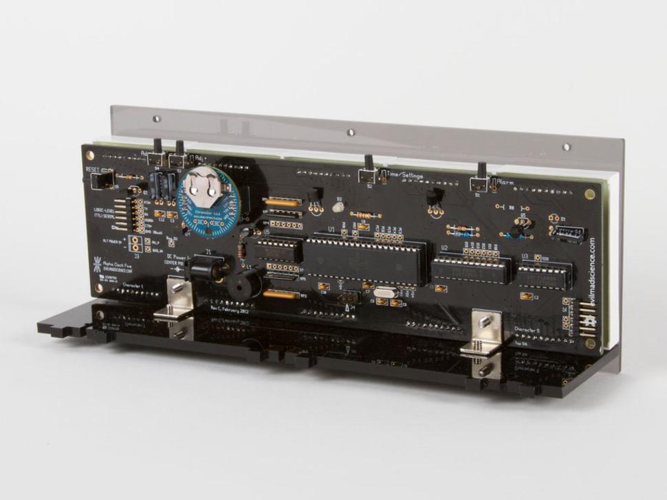 Evil Mad Scientist Labs presenteert de opmerkelijke Alpha Clock Five, een soldeerset die flair en functionaliteit combineert. Deze wekker is voorzien van vijf ultraheldere 2,3-inch alfanumerieke led-displays met een nauwkeurige Chronodot RTC, allemaal verpakt in een slanke, lasergesneden acryl behuizing.