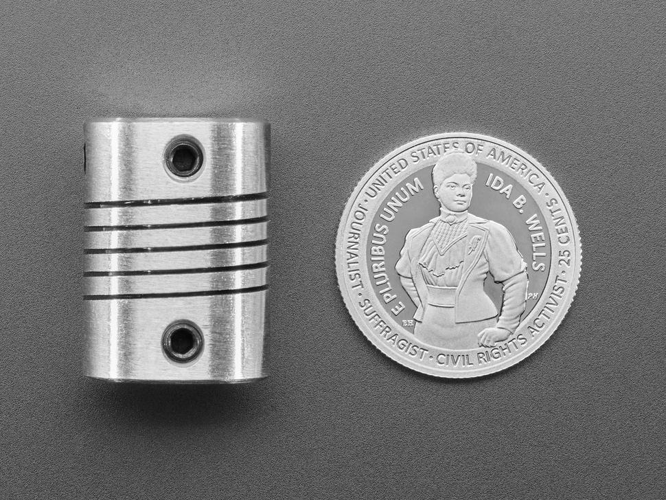 Verbind deze met een stelschroefkoppeling. Deze koppelingen zijn gemaakt van bewerkt aluminium en hebben een spiraalvormige snede waardoor ze licht flexibel zijn, waardoor ze op twee assen passen, zelfs als ze niet perfect op elkaar aansluiten, en tegelijkertijd bindingseffecten helpen verminderen.