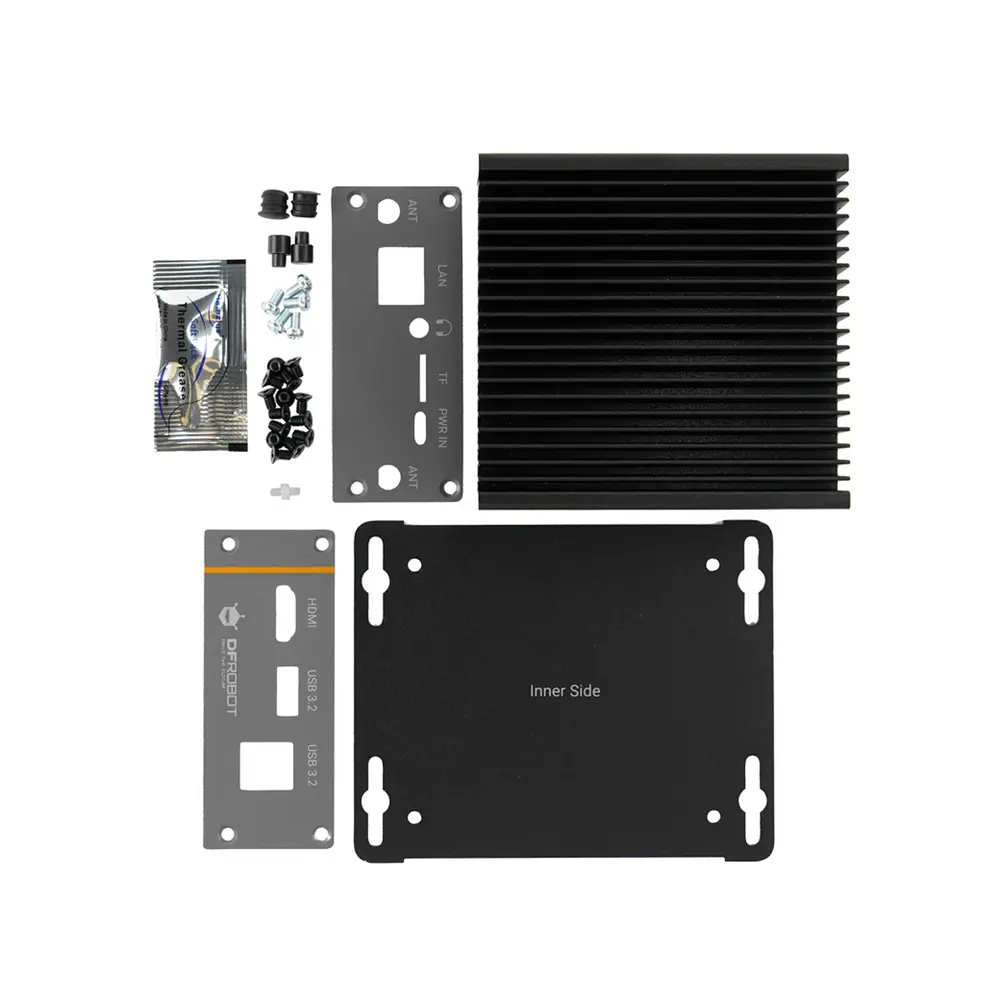 De aluminiumlegering van de case straalt sterkte en veerkracht uit, met een fijne gezandstraalde, glanzend zwarte geanodiseerde afwerking die bijdraagt aan de visuele aantrekkingskracht. Deze robuuste behuizing biedt uitstekende bescherming tegen fysieke schade zoals stoten en krassen. Hij dient als shield voor de interne componenten van de LattePanda IOTA, waardoor hij ideaal is voor zware en veeleisende omgevingen.