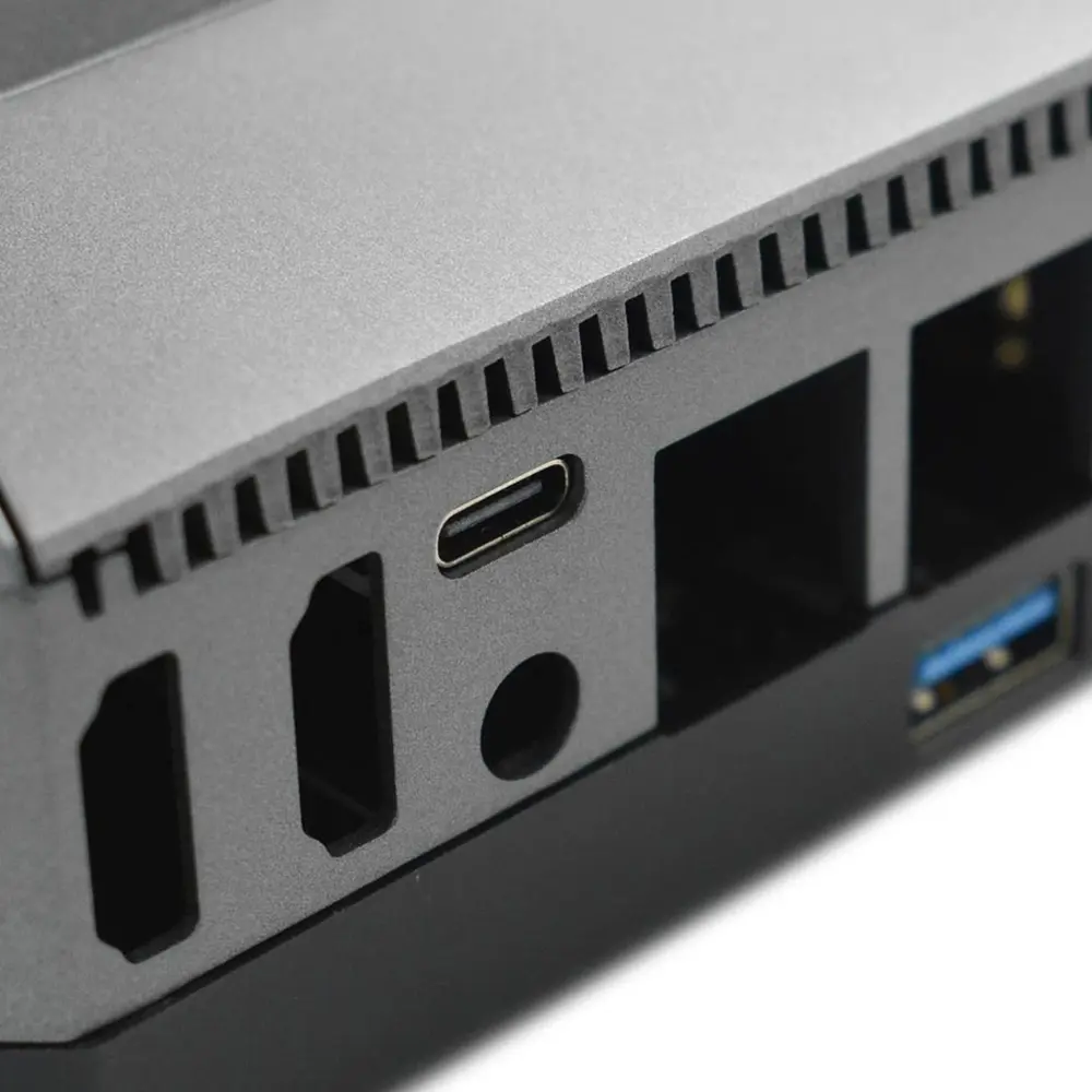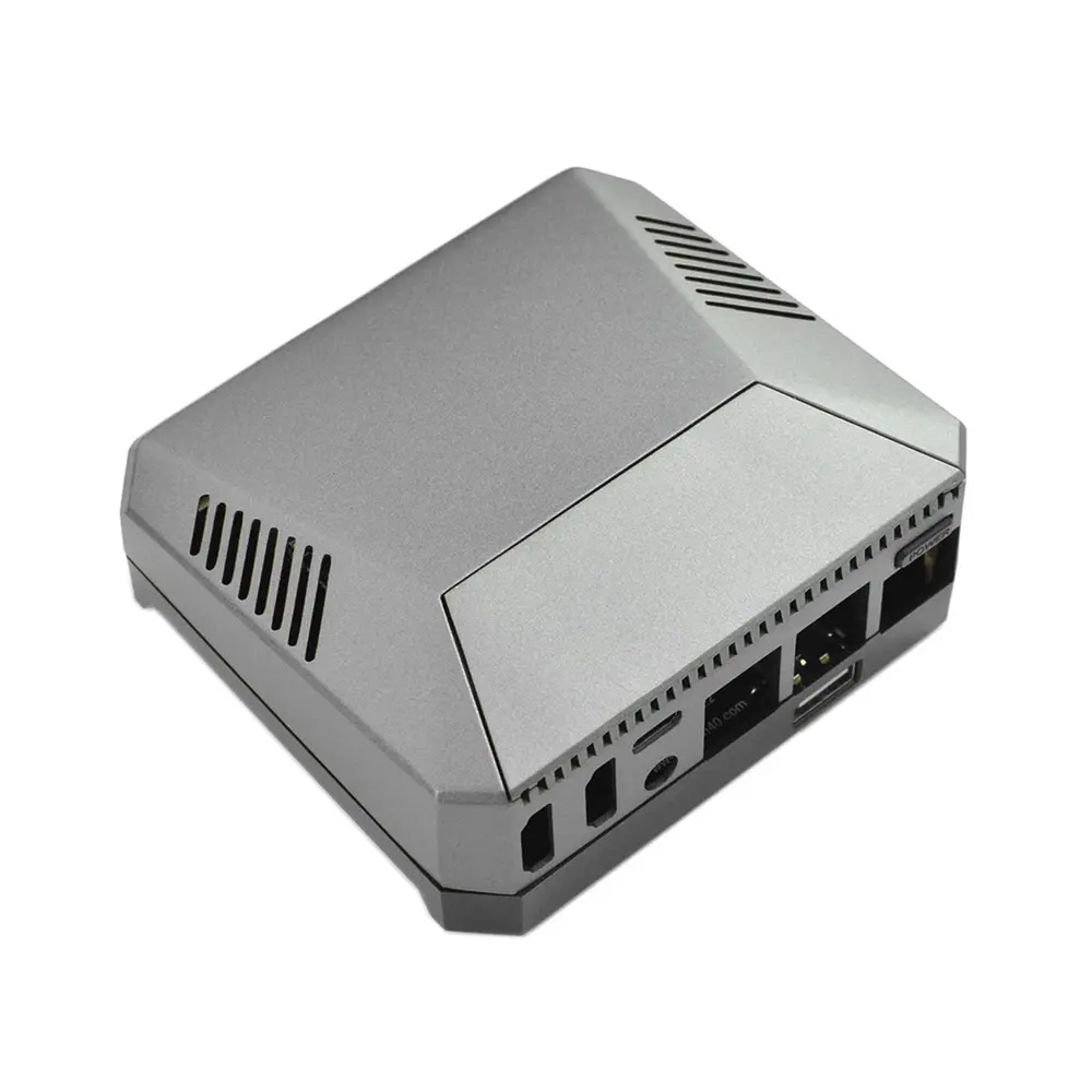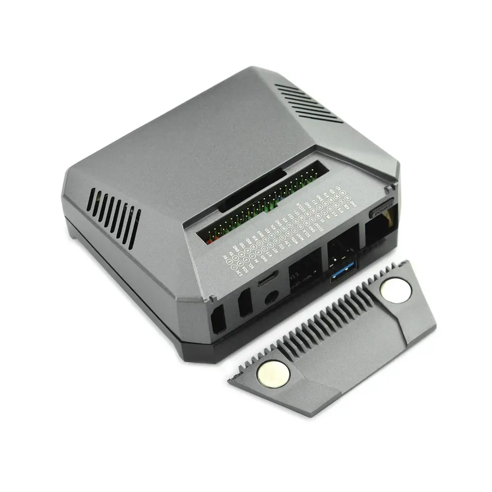 De behuizing, gemaakt van aluminiumlegering en afgewerkt in strak spacegrijs, heeft een magnetisch schuifontwerp. De magnetisch afneembare bovenkant toont GPIO-poorten met kleurgecodeerde labels voor eenvoudige identificatie en gebruik. Dit ontwerp combineert functionaliteit met esthetische aantrekkingskracht.