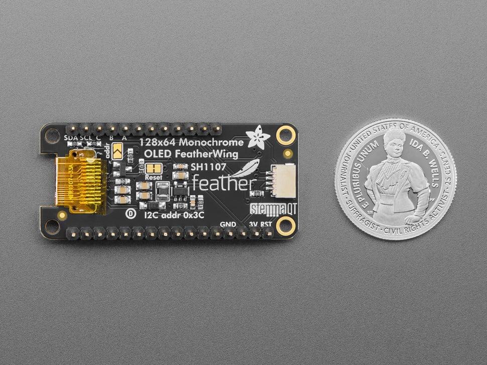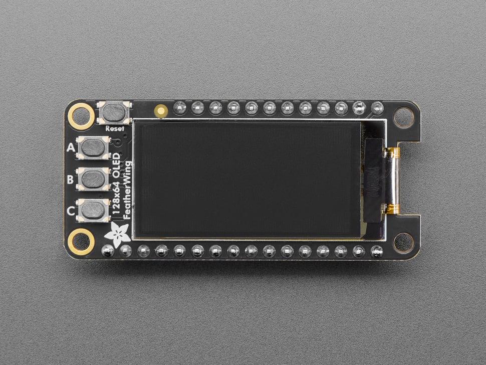 Een feather zonder ambitie is een feather zonder FeatherWings! Dit is de FeatherWing 128x64 OLED board hij voegt een prachtige 128x64 monochrome OLED plus 3 board toe aan elk feather board .