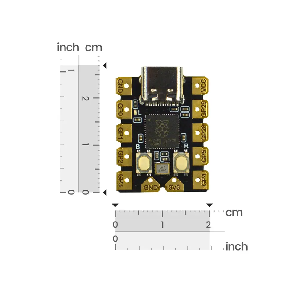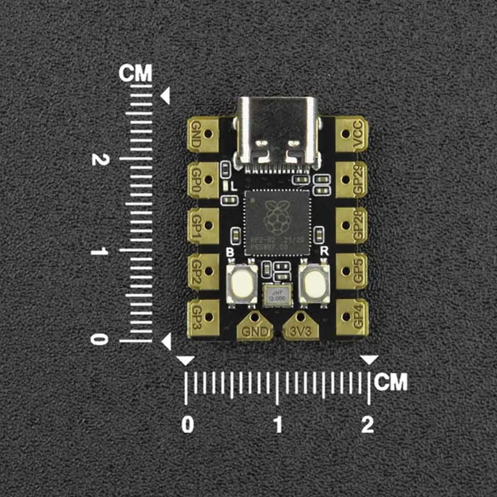 De DFRobot Beetle RP2040, gebouwd rond de veelzijdige RP2040-chip, valt op door zijn compacte formaat van slechts 27 mm bij 20 mm. Dit maakt hem de ideale keuze voor toepassingen die ruimtebesparende oplossingen vereisen, die gemakkelijk in kleine apparaten of discrete projecten passen zonder dat dit ten koste gaat van de prestaties.