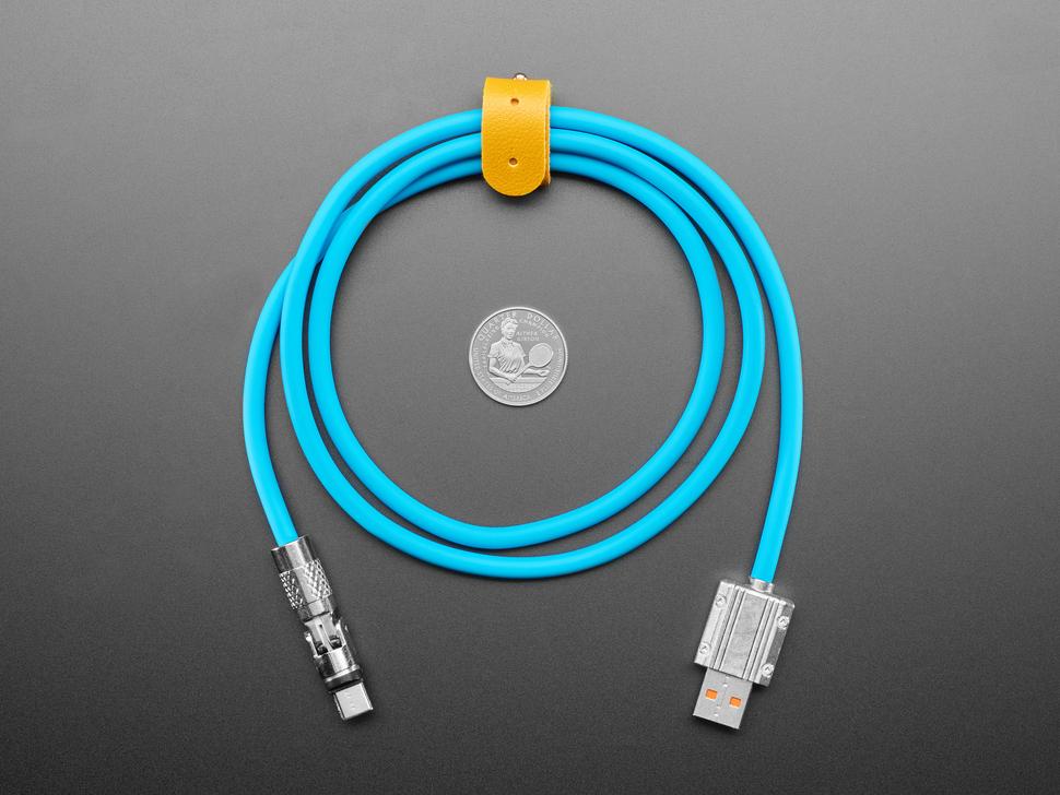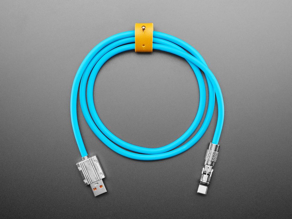 Onze nieuwste toevoeging aan de collectie is deze mechatronische 1-meter lange Blauwe USB-kabel met een USB Type A naar een 540º Draaibare USB Type C. We vinden vooral de Muad'Dib-blauwe indicator LED geweldig wanneer de kabel stroom heeft en je apparaat oplaadt. USB C is de nieuwste industriestandaard connector voor het verzenden van data en stroom. De draaibare USB-C zorgt ervoor dat je een omhoog, omlaag of hoek naar rechts kunt hebben, voor zowel links- als rechtsgerichte posities. De USB-C plug zelf kan ook draaien naar een verticale of horizontale positie. Er zit een leuke, gele, stoer uitziende push-hole band bij om de kabel samen te houden. Let op dat omdat dit een USB A naar C kabel is, hij alleen goed is voor USB 2.0 snelheden en signalen.