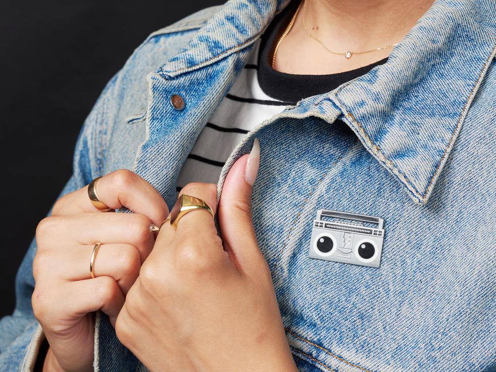 De Boomy Boombox-speld is een nostalgische knipoog naar de iconische muziekcultuur uit de jaren 80, gecombineerd met modern vakmanschap. Het robuuste ontwerp is voorzien van twee vlindersluitingen die zorgen voor een veilige pasvorm op elke stof, waardoor het zowel een stijlvol accessoire als een statement piece is.