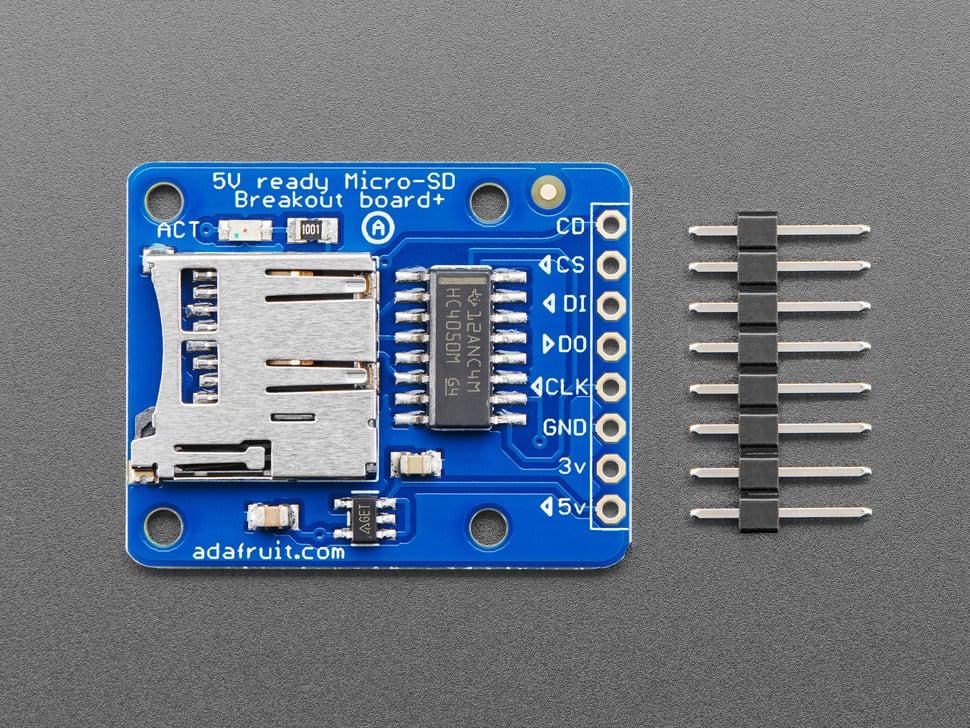 Om met een Arduino te gebruiken, sluit je GND aan op aarde, 5V op 5V, CLK op pin 13, DO op pin 12, DI op pin 11 en CS op pin 10. Vervolgens kun je de Arduino IDE's SD-library gebruiken die FAT en FAT32 ondersteunt. SD-kaarten. Bekijk onze gedetailleerde tutorial voor meer informatie over hoe je aan de slag kunt gaan, het bespreekt microSD-kaarten, bedrading en hoe je dit breakout-bord kunt gebruiken met een Arduino of CircuitPython