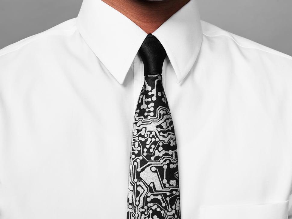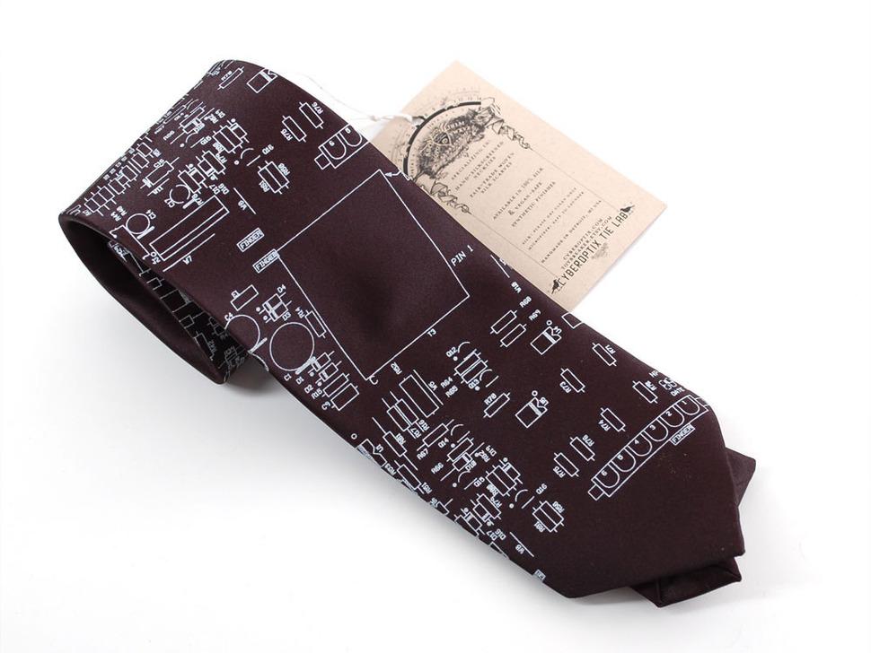 Deze strakke zwarte stropdas, versierd met ingewikkelde vintage board en subtiel bedrukt met zilveren inkt, legt de essentie van retrotechnologie vast in moderne mode. Een prachtig staaltje van Bethany "Toybreaker" Shorb van Cyberoptix: elke stropdas maakt deel uit van een gelimiteerde oplage die een ode brengt aan vergeten zeefdrukpatronen uit de late jaren 80.