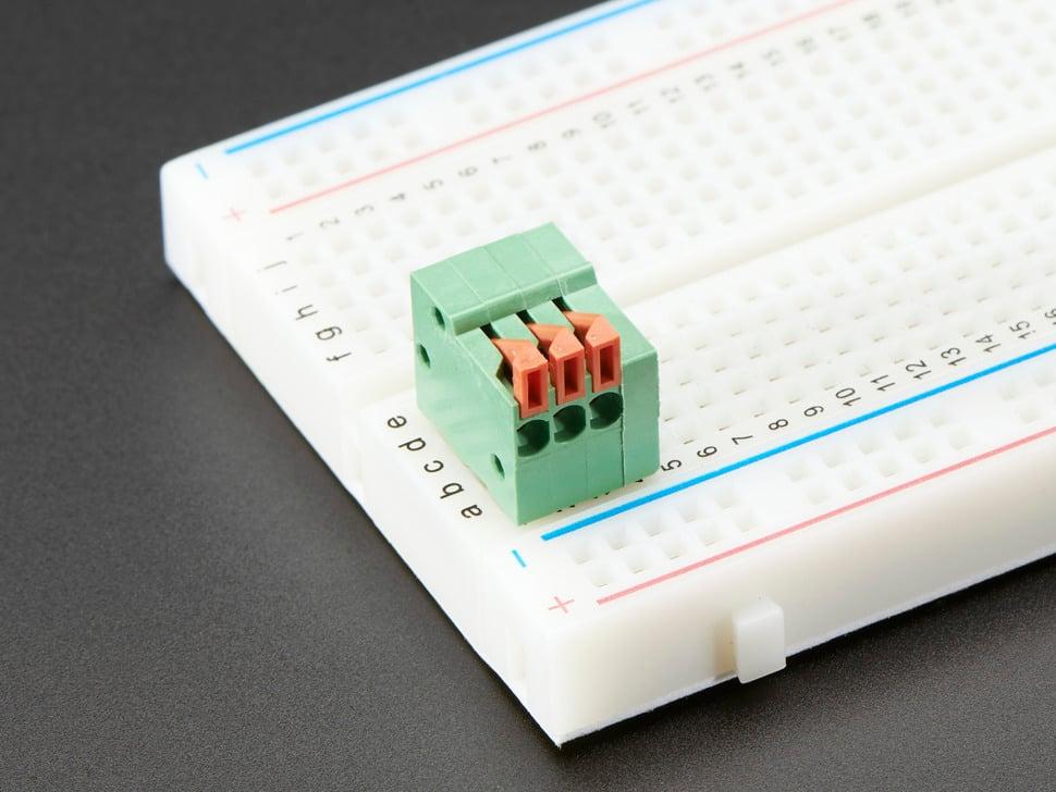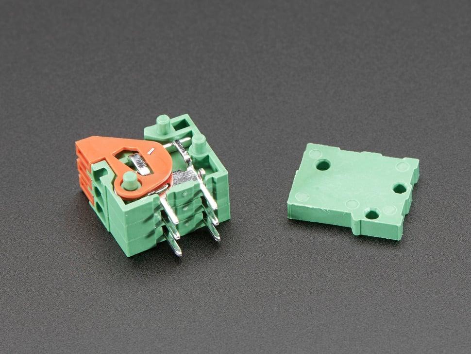 terminal blocks vereenvoudigen de bedrading en verhogen de duurzaamheid van uw project. Soldeer deze klemmen met een pitch van 0,1" op uw board in plaats van draden. Dankzij het veercontactmechanisme kunt u eenvoudig draden van 20 tot 26 AWG insteken, zowel massieve als stranded kern, voor veilige en flexibele verbindingen.