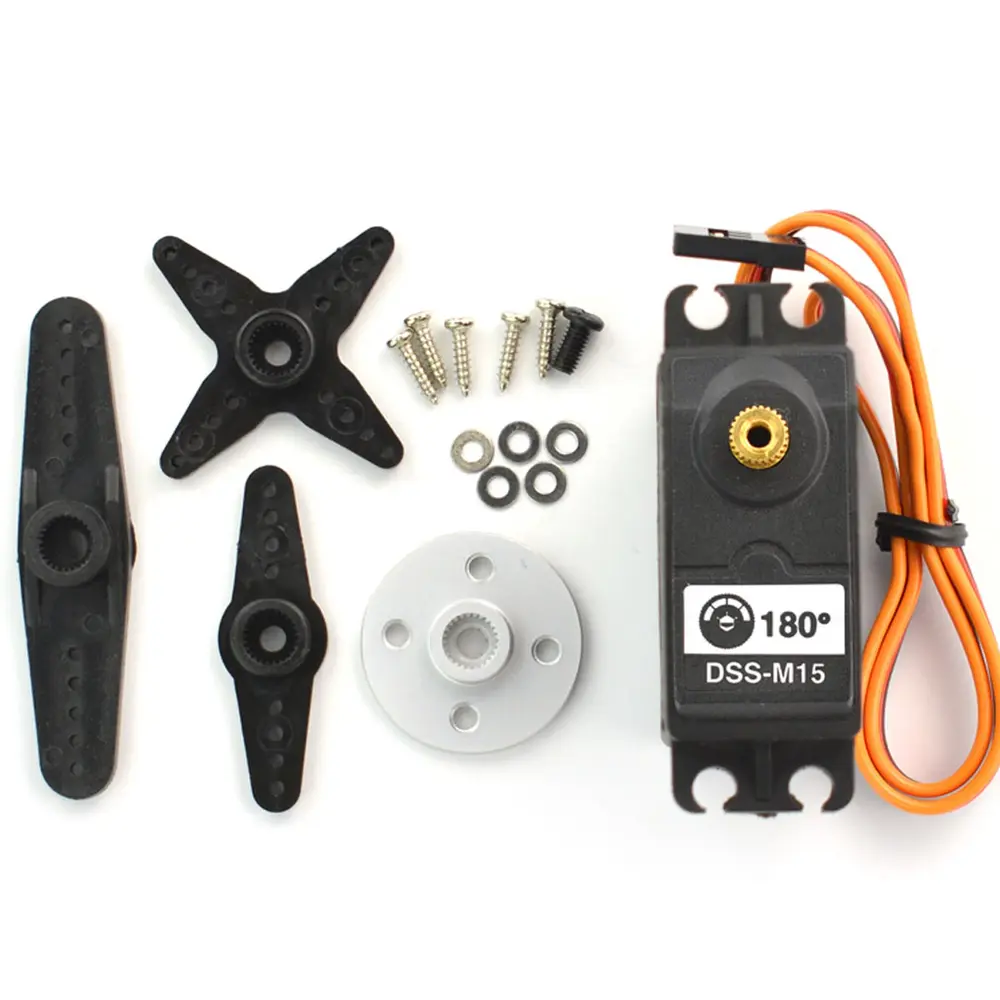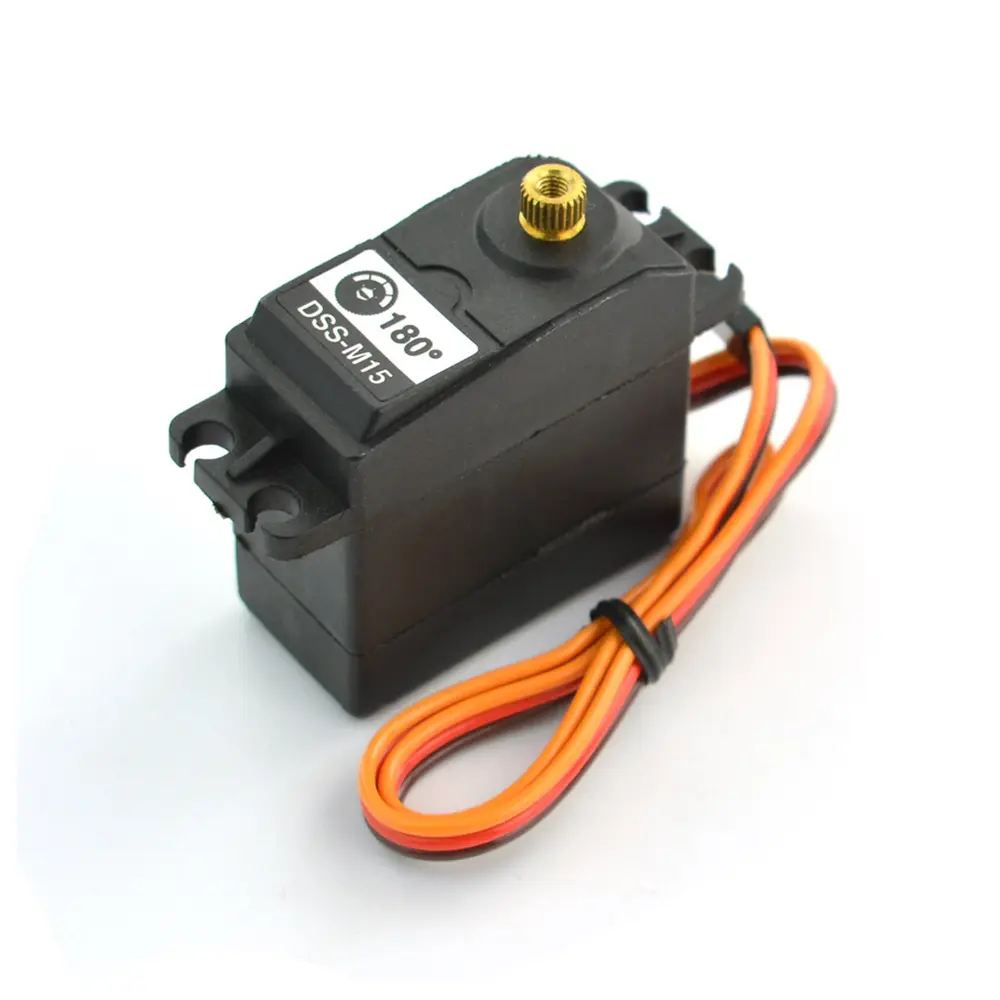 De DSS-M15 is een veelzijdige, robuuste standaard servo met metalen tandwielen, ontworpen voor een breed bewegingsbereik van 180 graden met uitzonderlijke stabiliteit en verbeterde duurzaamheid. Deze servo is perfect ontworpen voor veeleisende taken en is gebouwd om lang mee te gaan en biedt betrouwbaarheid in elke toepassing. Met een indrukwekkend vermogen om 6V op te nemen en consistent meer dan 15 kg koppel te leveren, garandeert de DSS-M15 robuuste prestaties, of het nu gaat om robotica, modelbouw of andere mechanische projecten waar precisie en kracht van het grootste belang zijn.