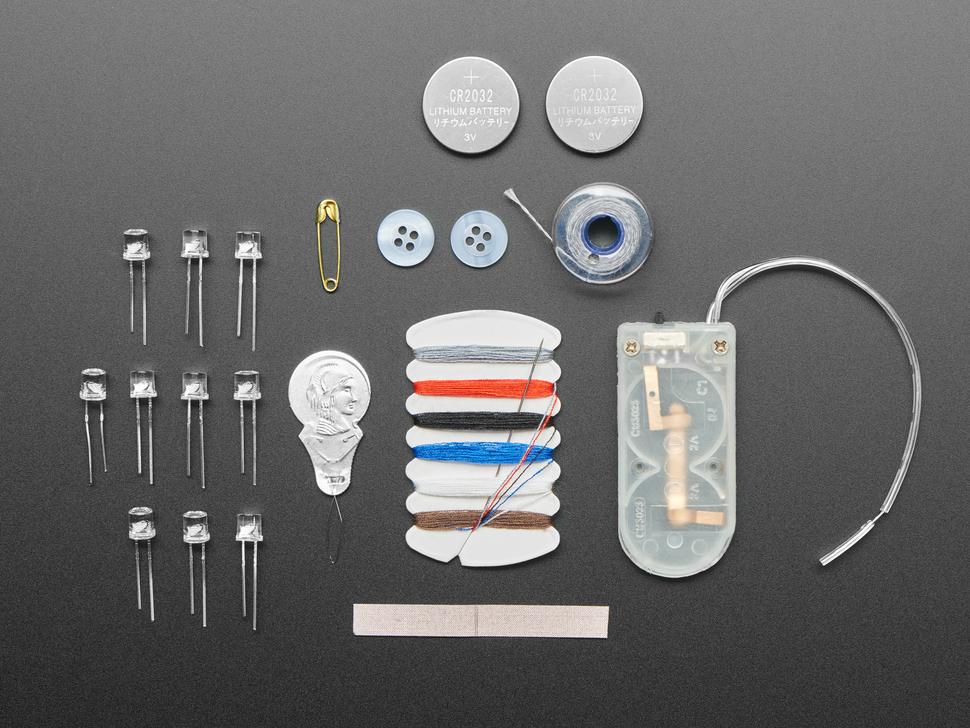 De set bevat een glinsterende, gezeefdrukte tas met een gepersonaliseerd vakje, 10 knipperende LED-lampjes, een battery pack met batterijen, geleidende tape, geleidend garen en een kleine naaiset. Perfect om je outfit een vleugje glitter te geven, deze tas is even praktisch als stijlvol.