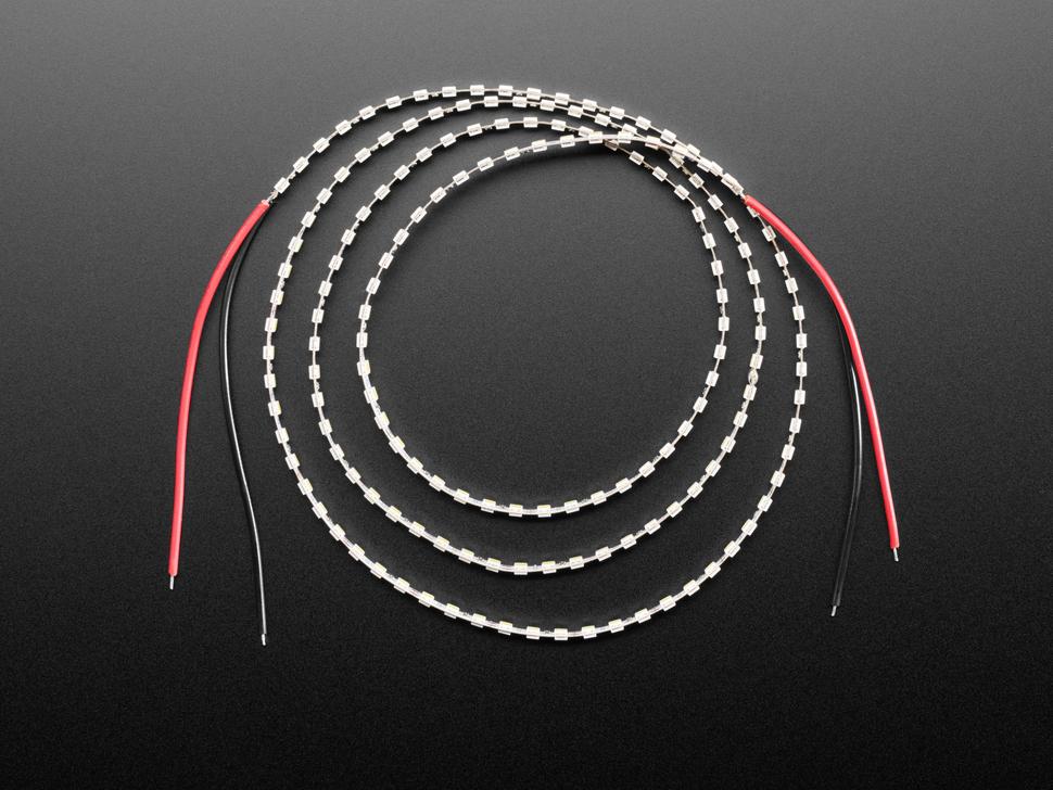 De strip trekt maximaal ongeveer 950 milliAmpère bij 12V, of 275mA bij 9V. Het is makkelijk om aan te passen, je kunt de strip in stukjes van 17,5 mm knippen en opnieuw solderen als dat nodig is. Let op, dit zijn geen 'NeoPixel' LED-strips, dus je kunt de individuele LED's niet apart aan- of uitzetten.
